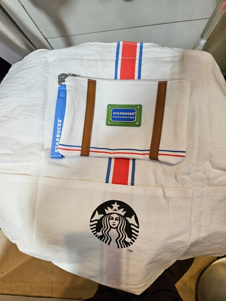 Selling a Starbucks tote bag that comes with a matching pouch! It's in great condition and perfect for carrying your essentials in style. The bag features the iconic Starbucks logo and a unique design. The pouch is handy for keeping smaller items organized