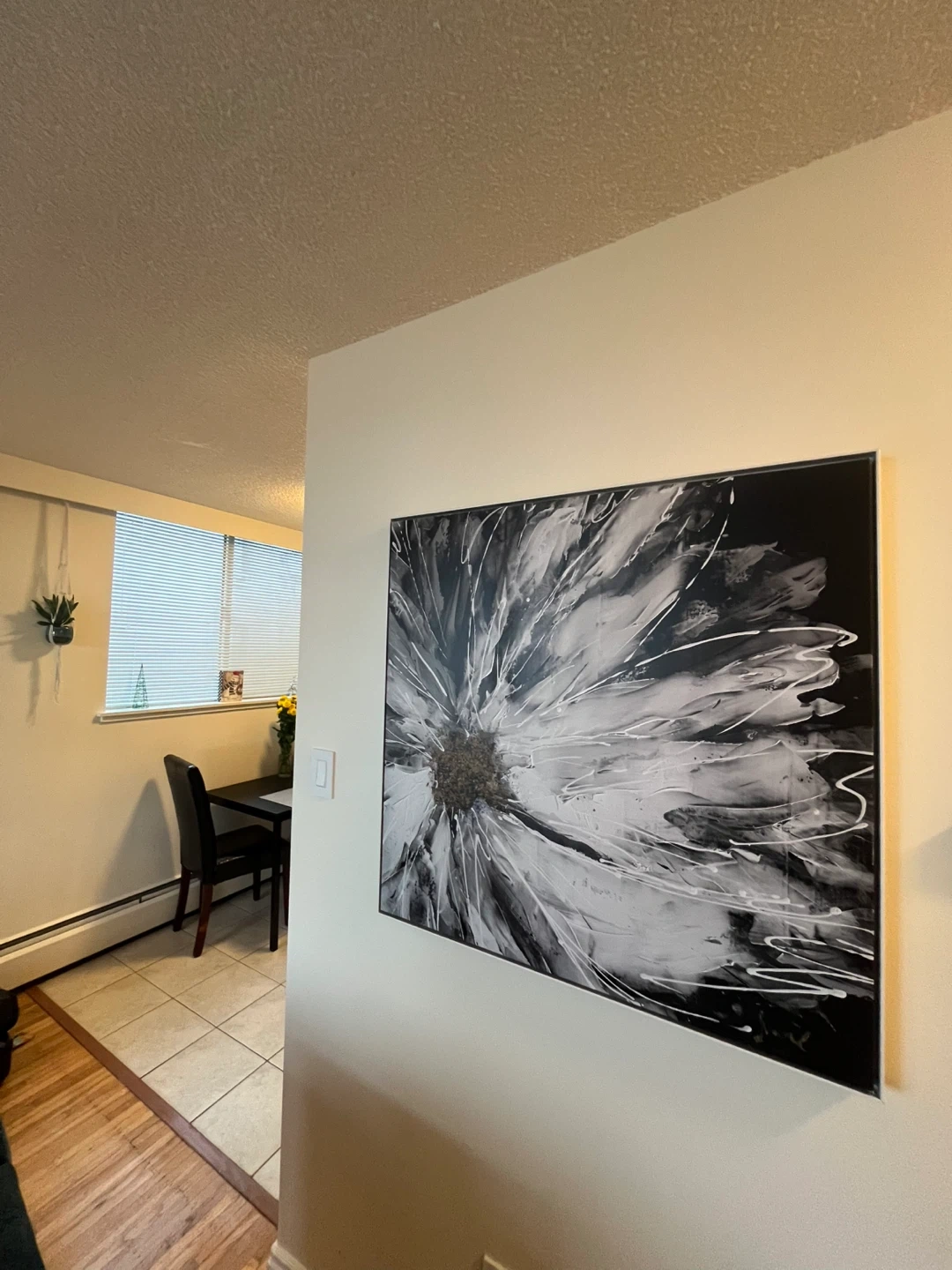 Selling a beautiful piece of floral wall art on a canvas! It features a striking black and white design that would look great in any room. It's in excellent condition and ready to brighten up your space. 3 feet by 3 feet.