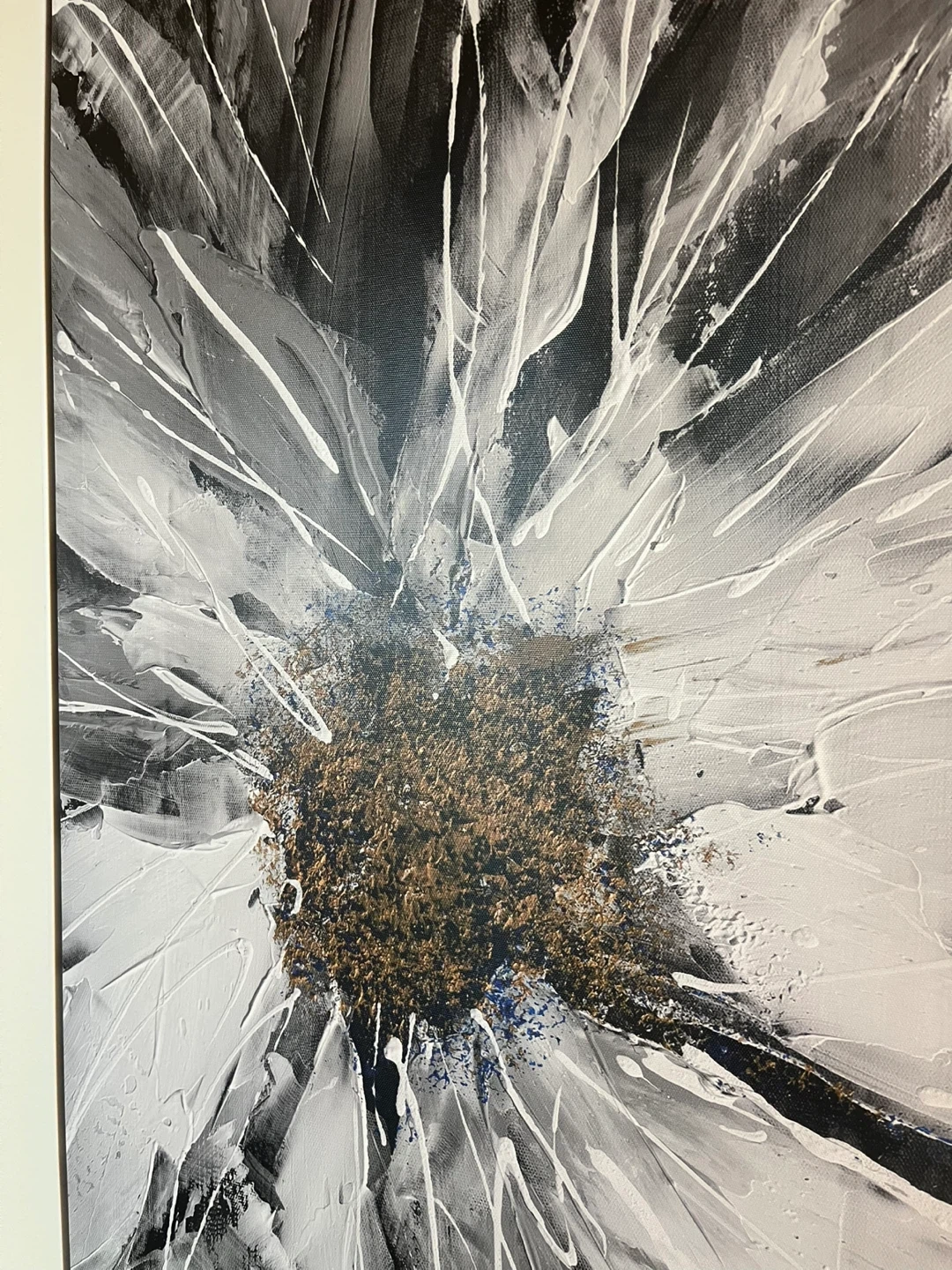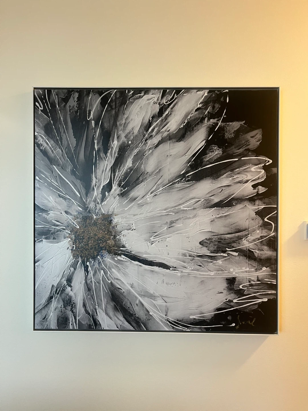 Selling a beautiful piece of floral wall art on a canvas! It features a striking black and white design that would look great in any room. It's in excellent condition and ready to brighten up your space. 3 feet by 3 feet.