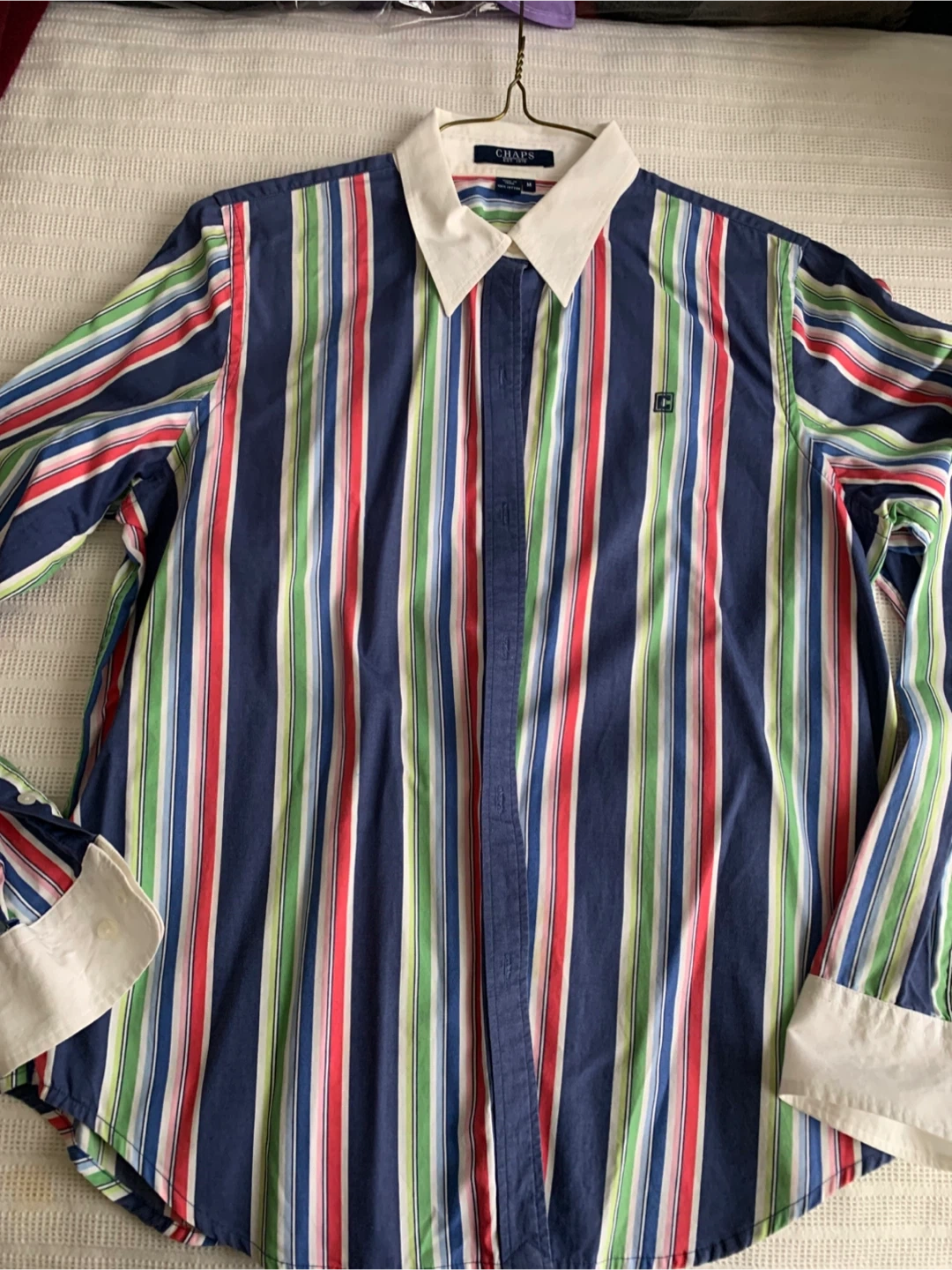Selling a CHAPS button-down shirt in size medium. It features a colourful striped pattern and is made from 100% cotton. Perfect for adding a pop of colour to your wardrobe!