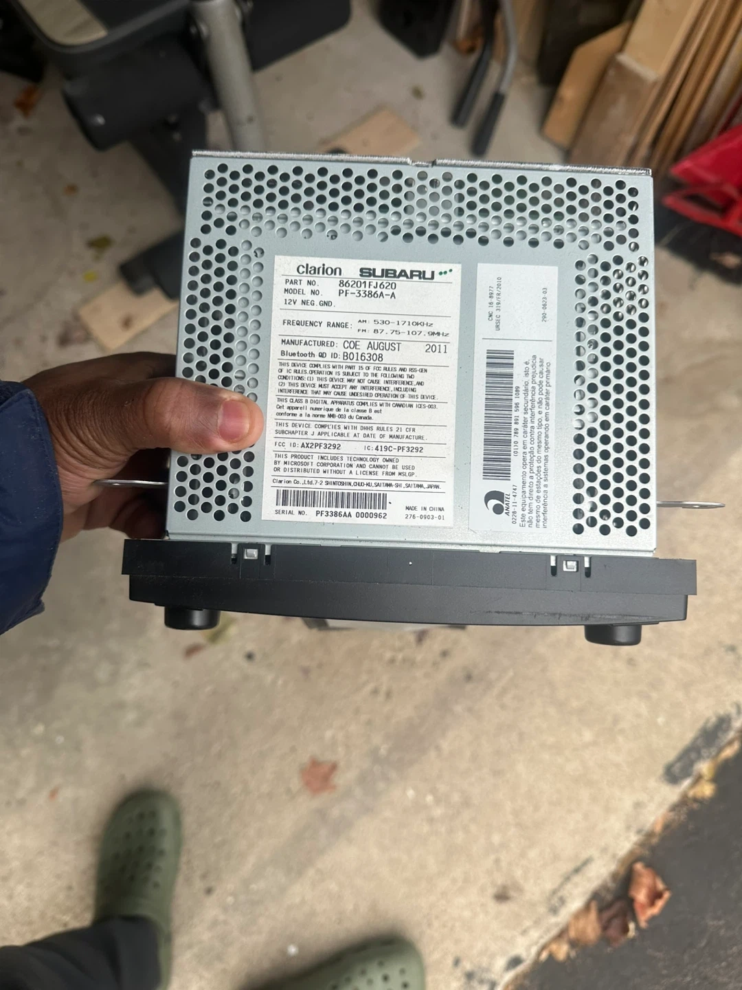 Selling a Clarion Subaru car stereo, model number PT-3386A-A. It's a 12V NEG.GND unit, manufactured in August 2011. Features include AM and FM frequency ranges.