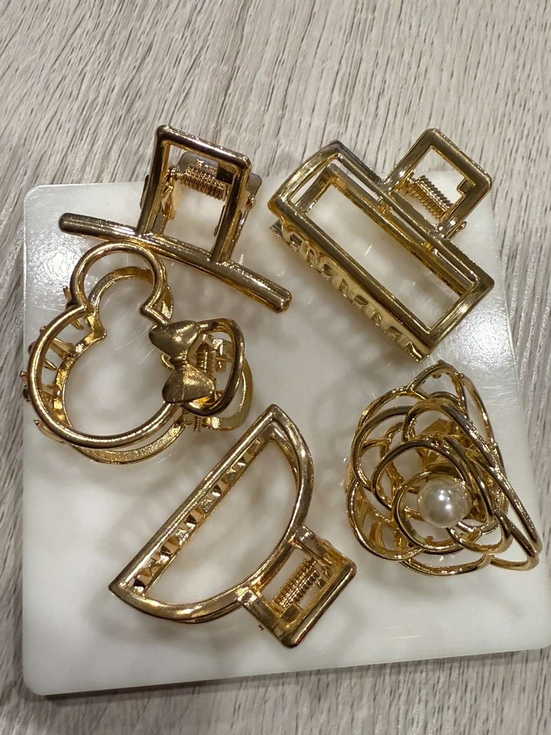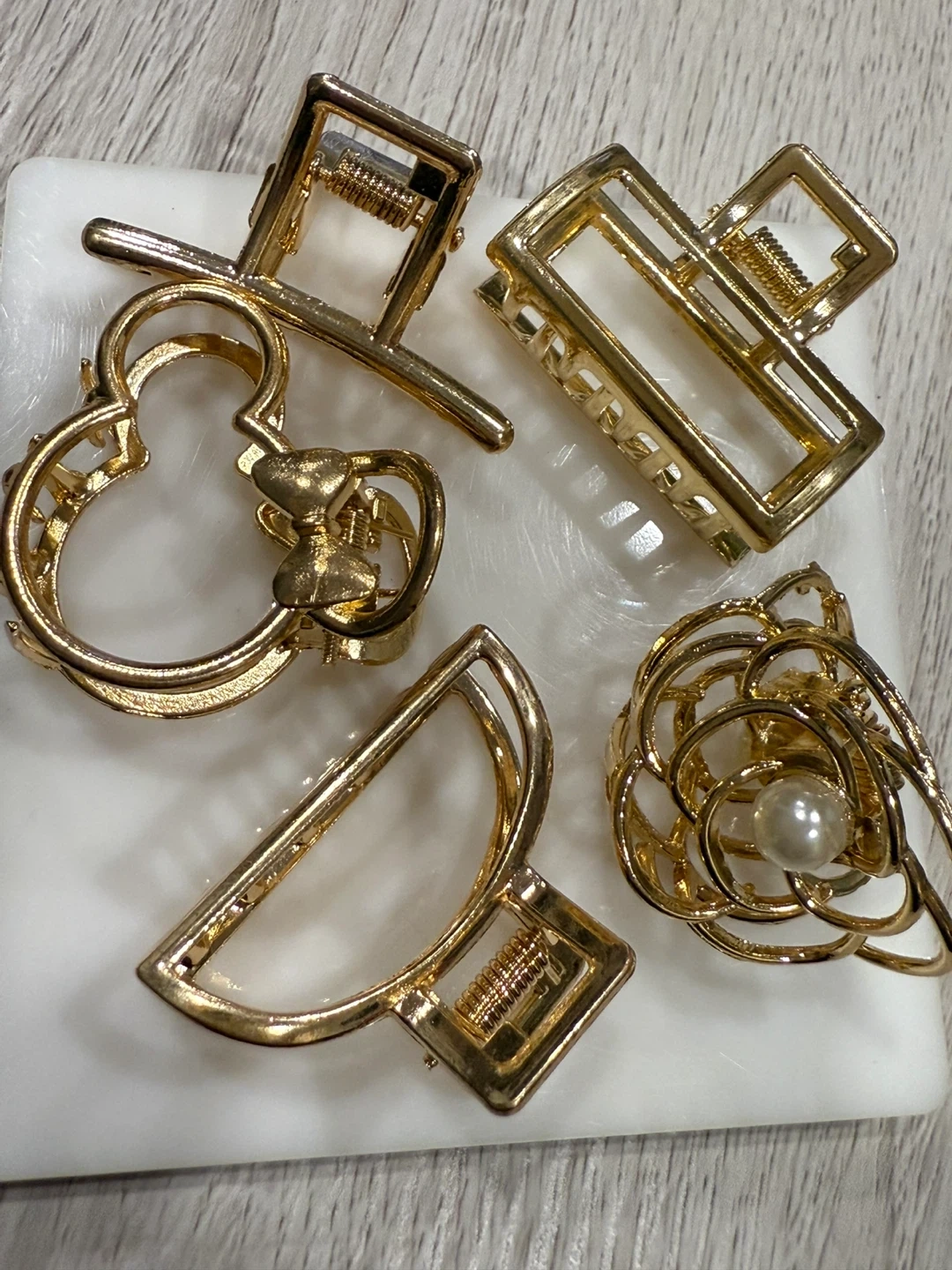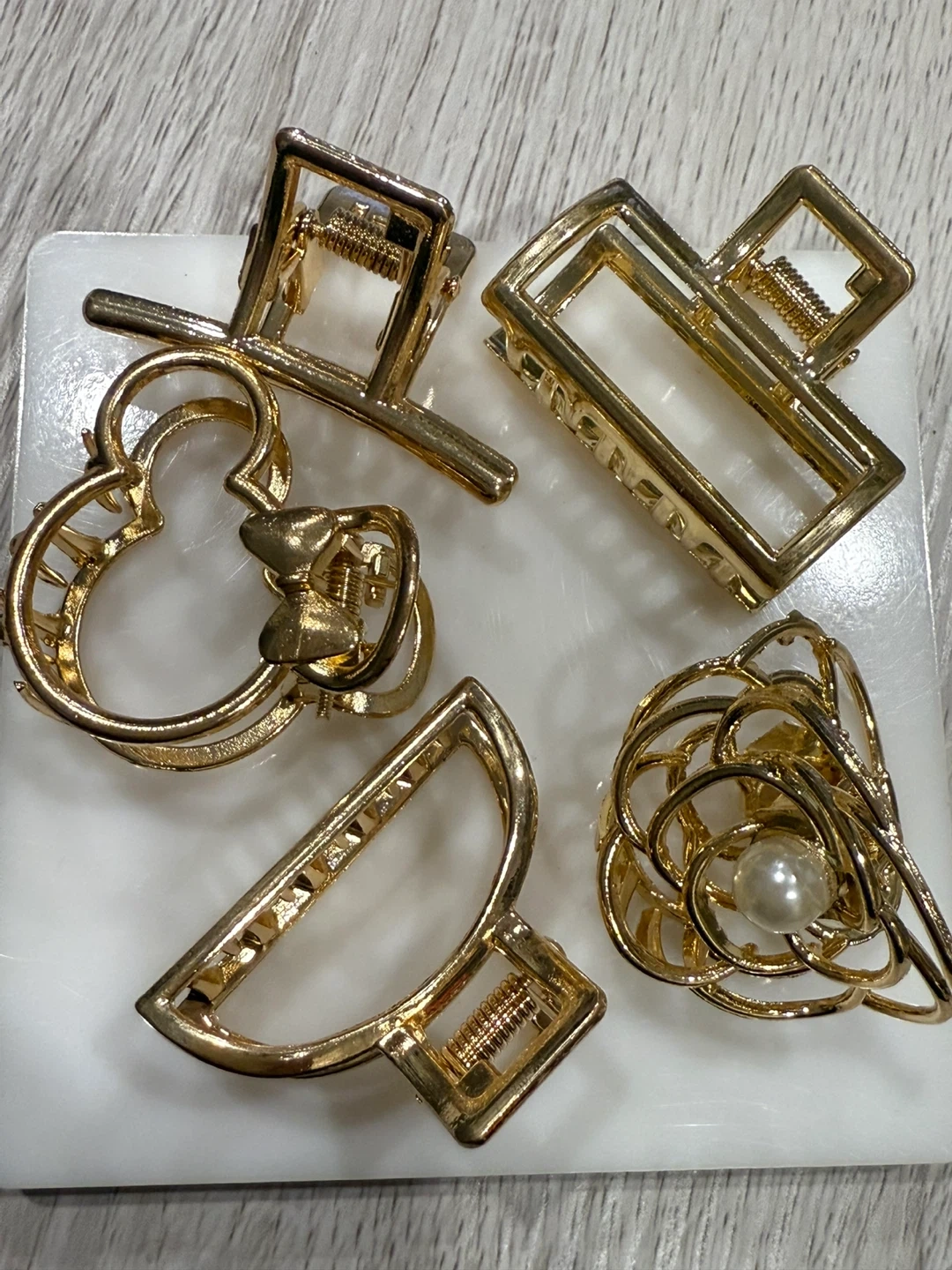 Selling a set of five gold-toned hair claw clips. They come in a variety of shapes and styles, perfect for any hair type or occasion! They're in great condition and ready for a new home