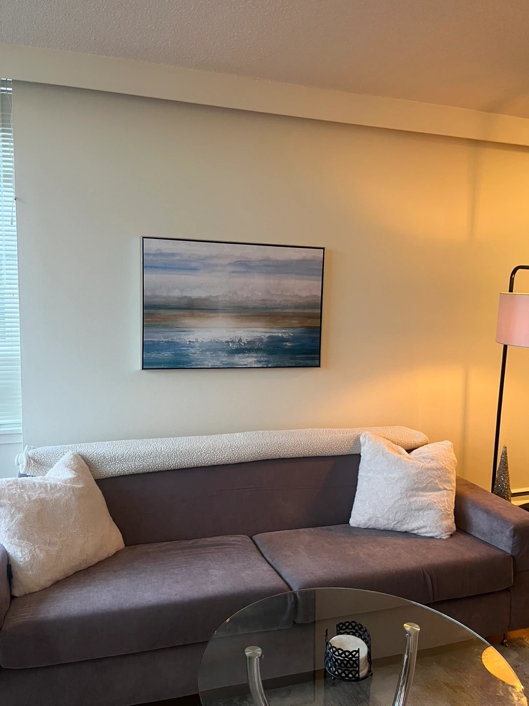 Framed piece of wall art featuring an abstract seascape design on a canvas. It would look great in any room, colors match a lot of different pieces of furniture and rugs. 37 x 25 inches