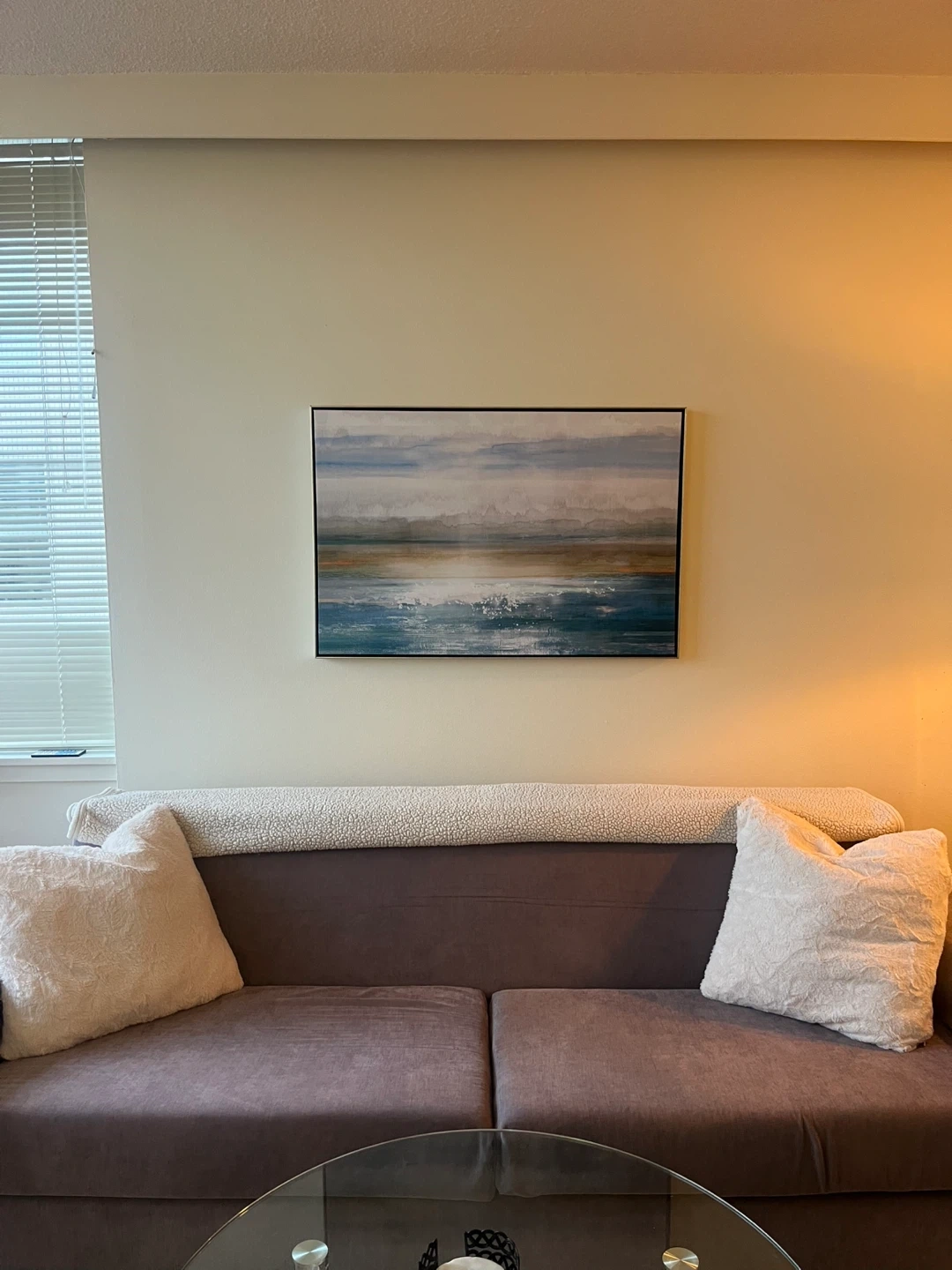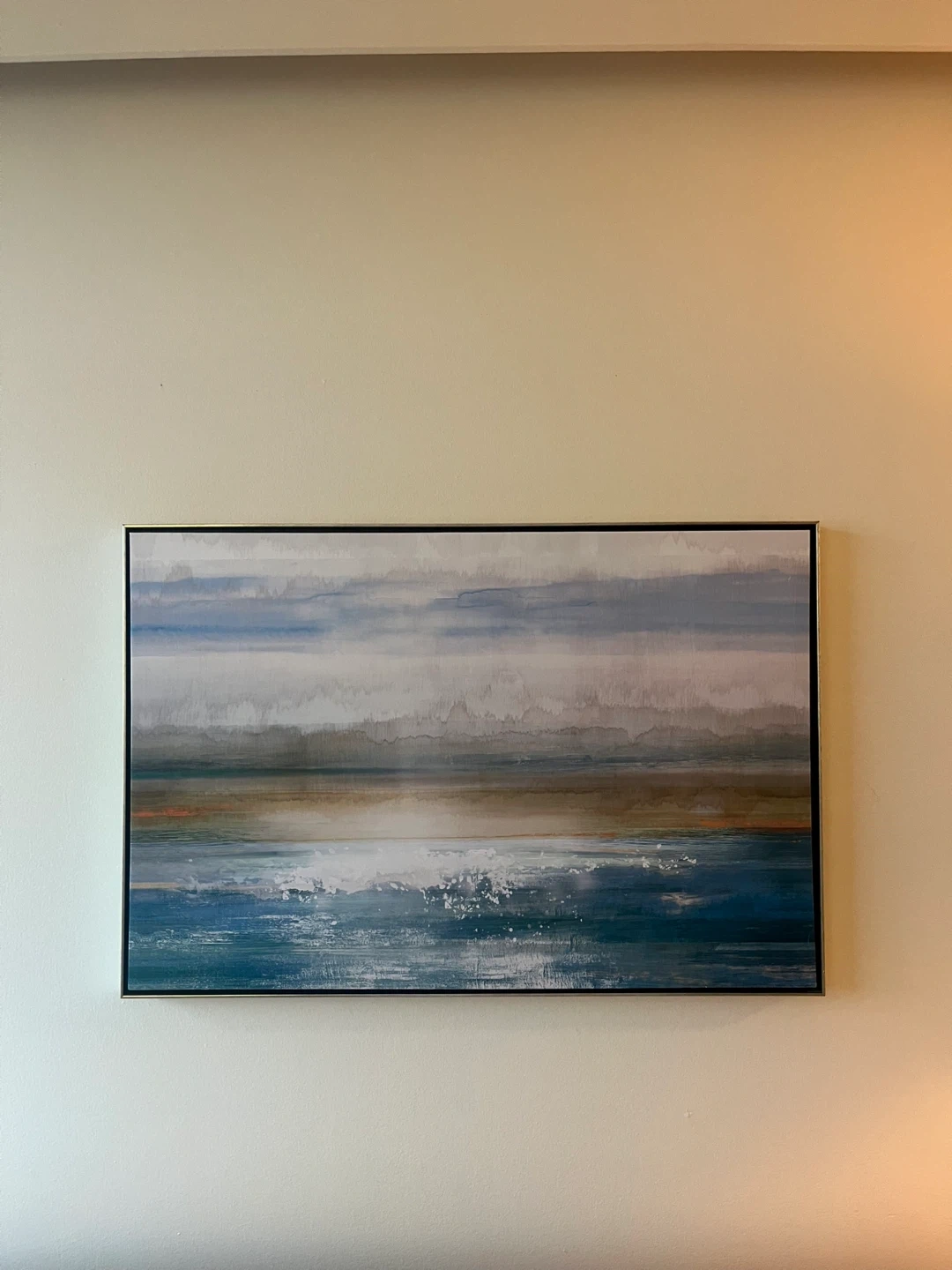 Framed piece of wall art featuring an abstract seascape design on a canvas. It would look great in any room, colors match a lot of different pieces of furniture and rugs. 37 x 25 inches
