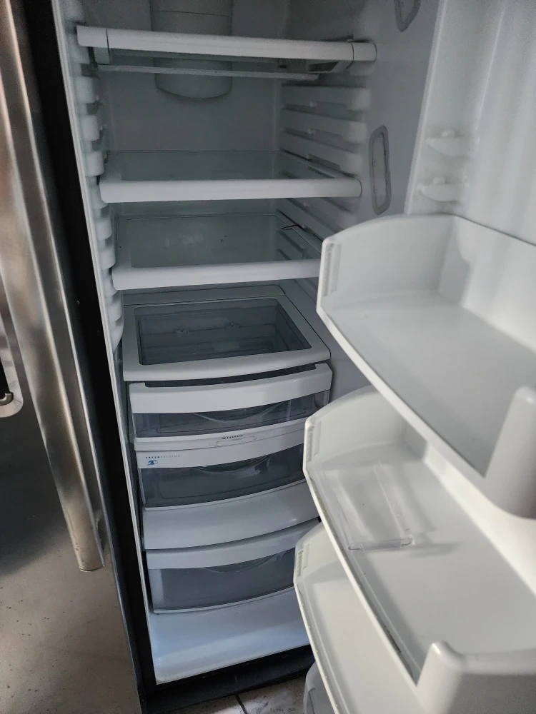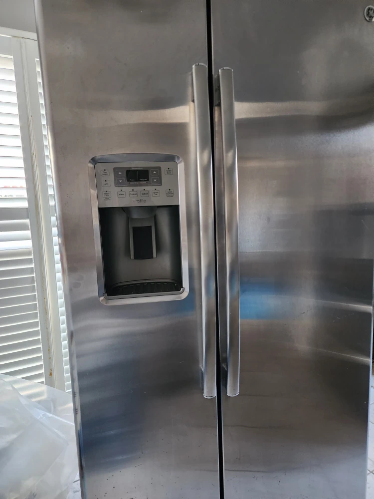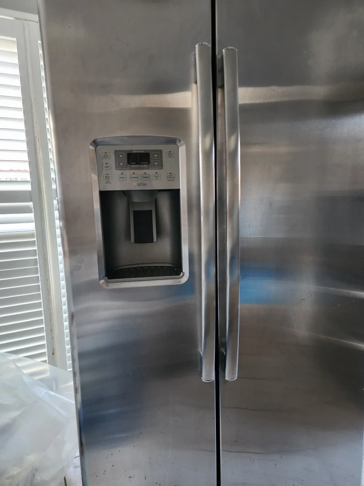 Selling a GE Profile refrigerator with a stainless steel finish. It features a water and ice dispenser. The interior includes adjustable shelves and drawers for organized storage. Good for any family! Ready for pick up. Value at 2000 and up, only a year old, moving sale.