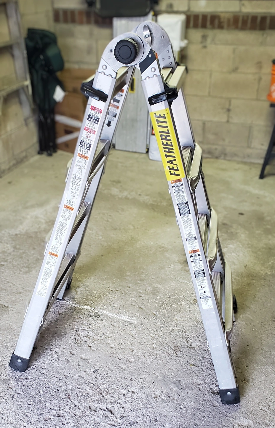 Aluminum multi-purpose ladder. 300 lbs. load capacity. Fully extended 18 feet. Folds up to 5 ft for easy storage. Adjustable to work on stairs.