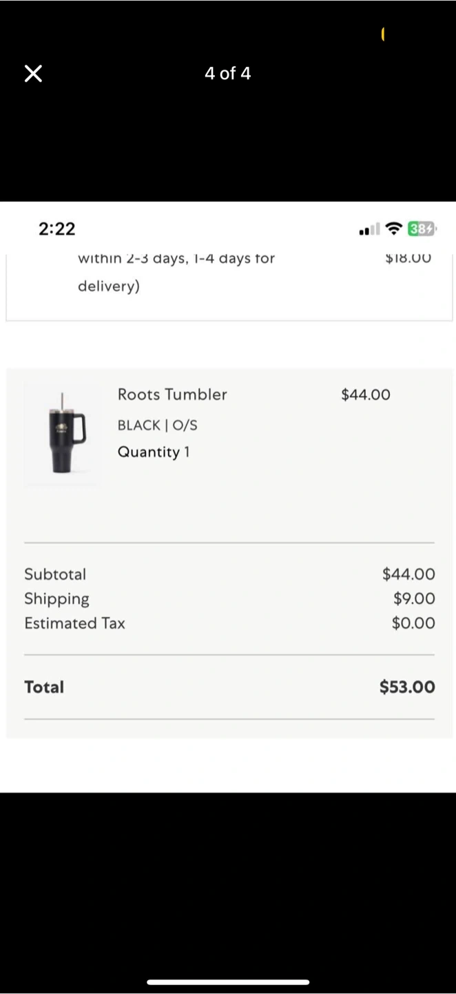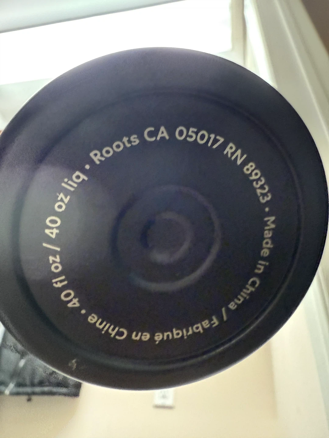 Keep your drinks hot or cold with this Roots tumbler! It's black, holds 40 oz, and comes with a handle and straw.