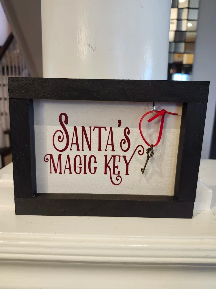 I'm selling these cute Santa's Magic Key framed decor pieces. They're perfect for adding a touch of Christmas magic to your home this holiday season! They feature a rustic wooden frame, a white background with the words "Santa's Magic Key" in a festive font, and a small key hanging from a red ribbon