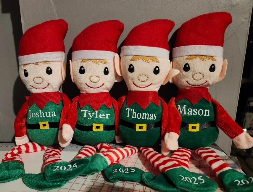 Get ready for the holidays with these adorable personalized Christmas elf plush toys! Each elf features a unique name and a cute design. The year 2025 is printed on the elf's foot.