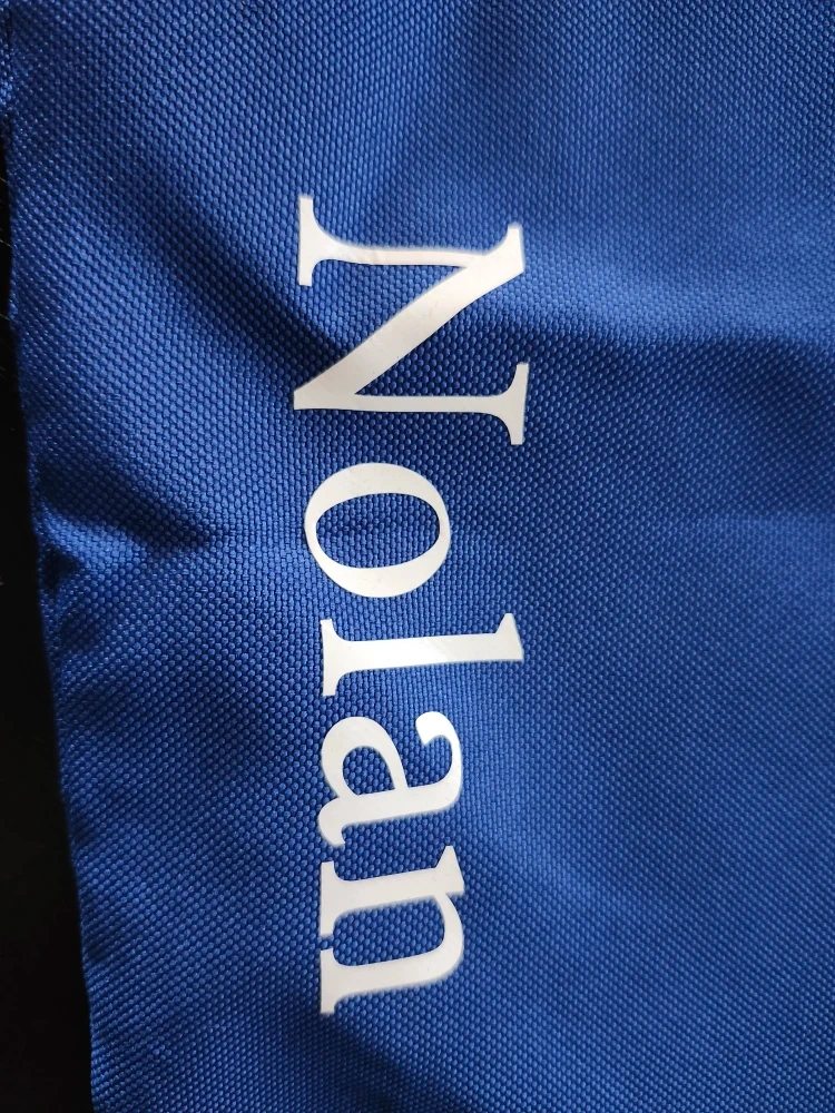 A simple blue drawstring bag with the name 'Nolan' printed on it. Perfect for carrying gym clothes or other essentials!