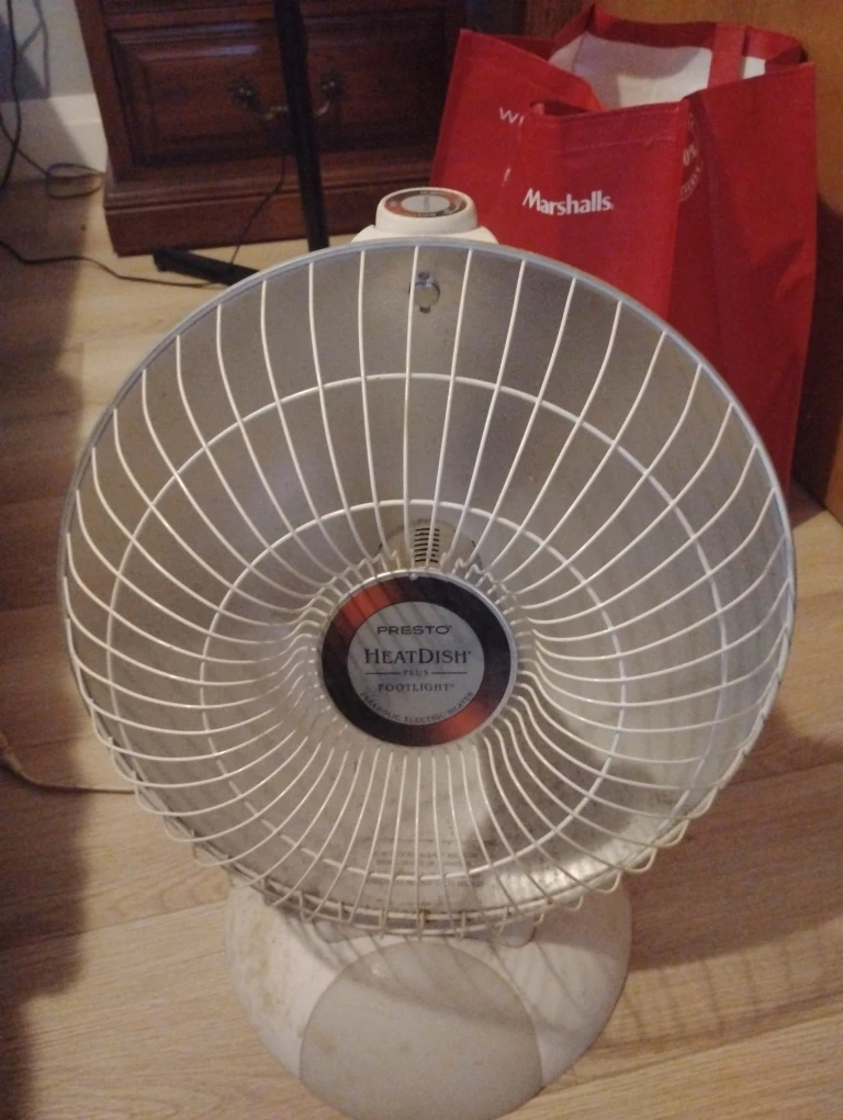 Here's a Presto HeatDish Footlight electric space heater. It has settings for off, low, med, and hi. Great for keeping your feet warm on cold days!
