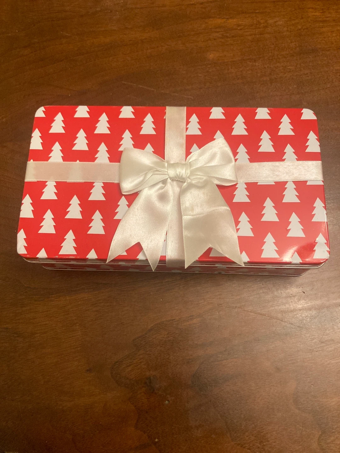 Cute red and white tin box with a Christmas tree pattern and a white ribbon design from Loblaws. Originally $5, still has price sticker. Perfect for storing small items or gifting treats.