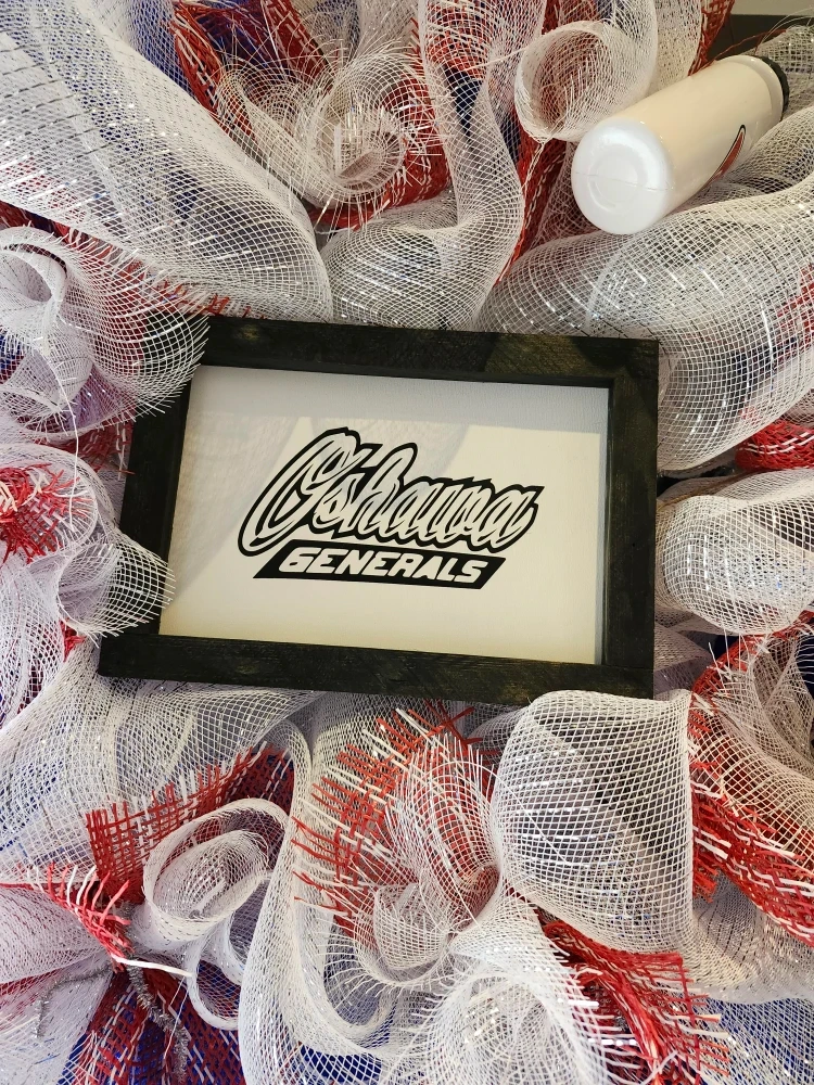 Handmade Oshawa Generals wreath, perfect for showing your team spirit! This unique wreath features the Oshawa Generals logo and team colours, making it a great addition to any fan's collection