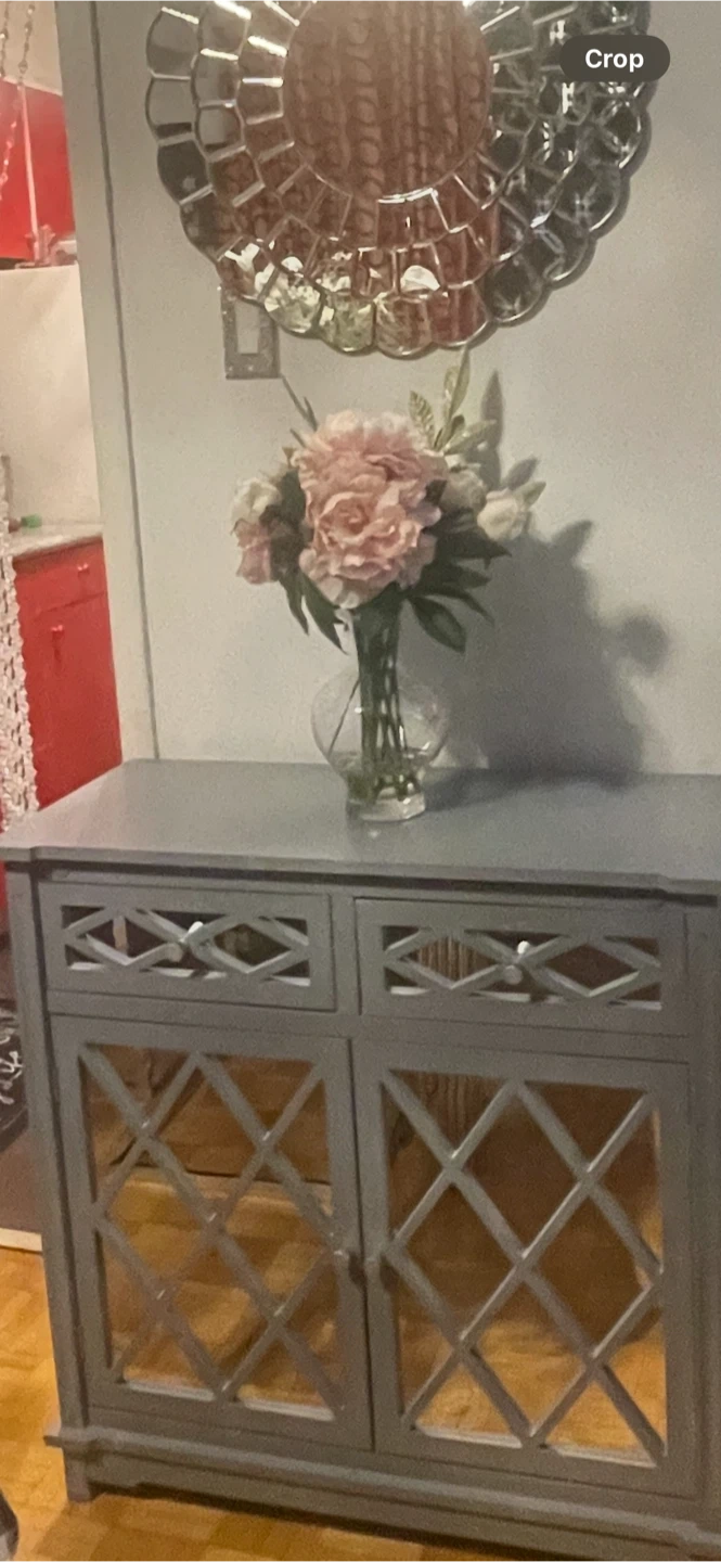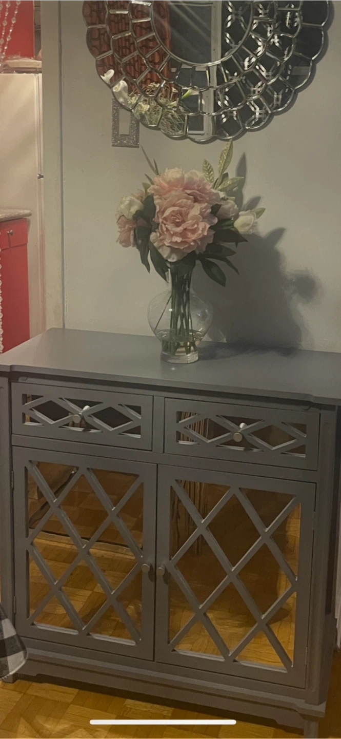 A lovely grey cabinet with lattice detailing on the doors. It's perfect for adding a touch of elegance to any room. It has drawers and cabinet space.