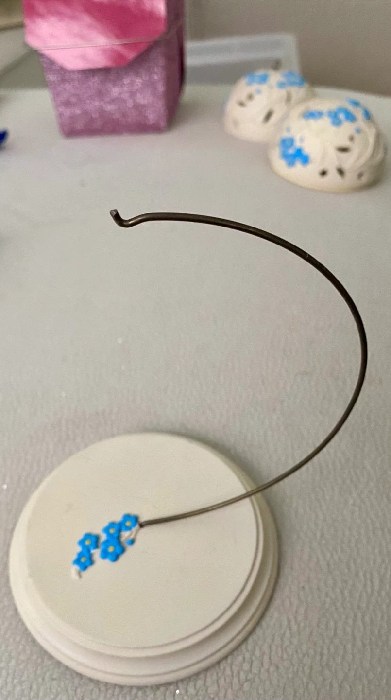 This makes a great gift! In great condition and comes with a stand! It has a lovely floral design with blue Forget-Me-Not flowers on a cream-colored sphere that unscrews in half to put small gifts or scented items inside.
