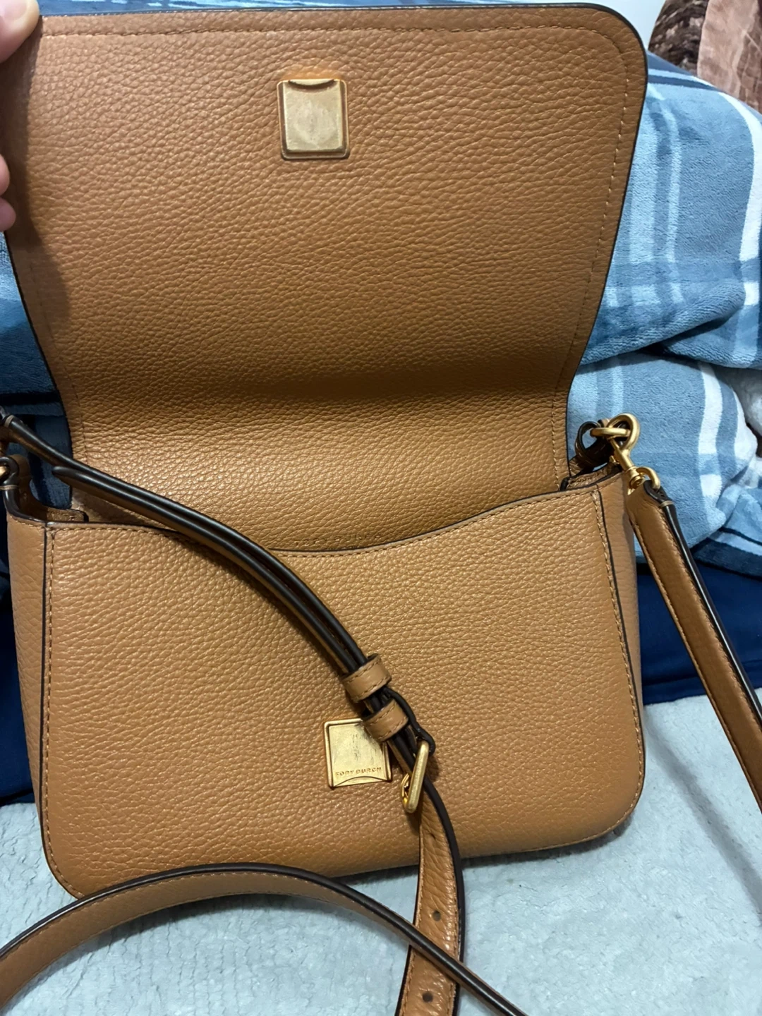 This is a lovely Tory Burch crossbody bag in excellent condition. It's a great size for everyday use and the leather is in beautiful shape. The colour is a versatile tan that goes with everything. Feel free to ask if you have any questions!