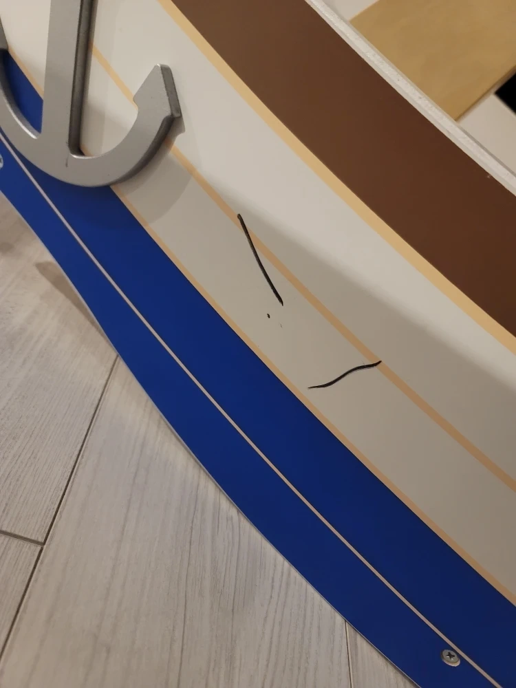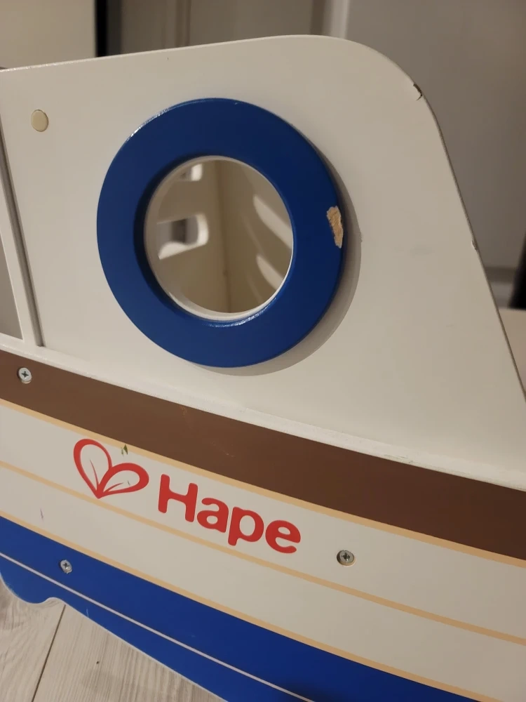Selling a Hape rocking boat ride-on toy! It's a cute and fun toy for kids. There are some visible signs of wear, like scratches on the side and a chip near the porthole, but it's still in good working condition and ready for a new home