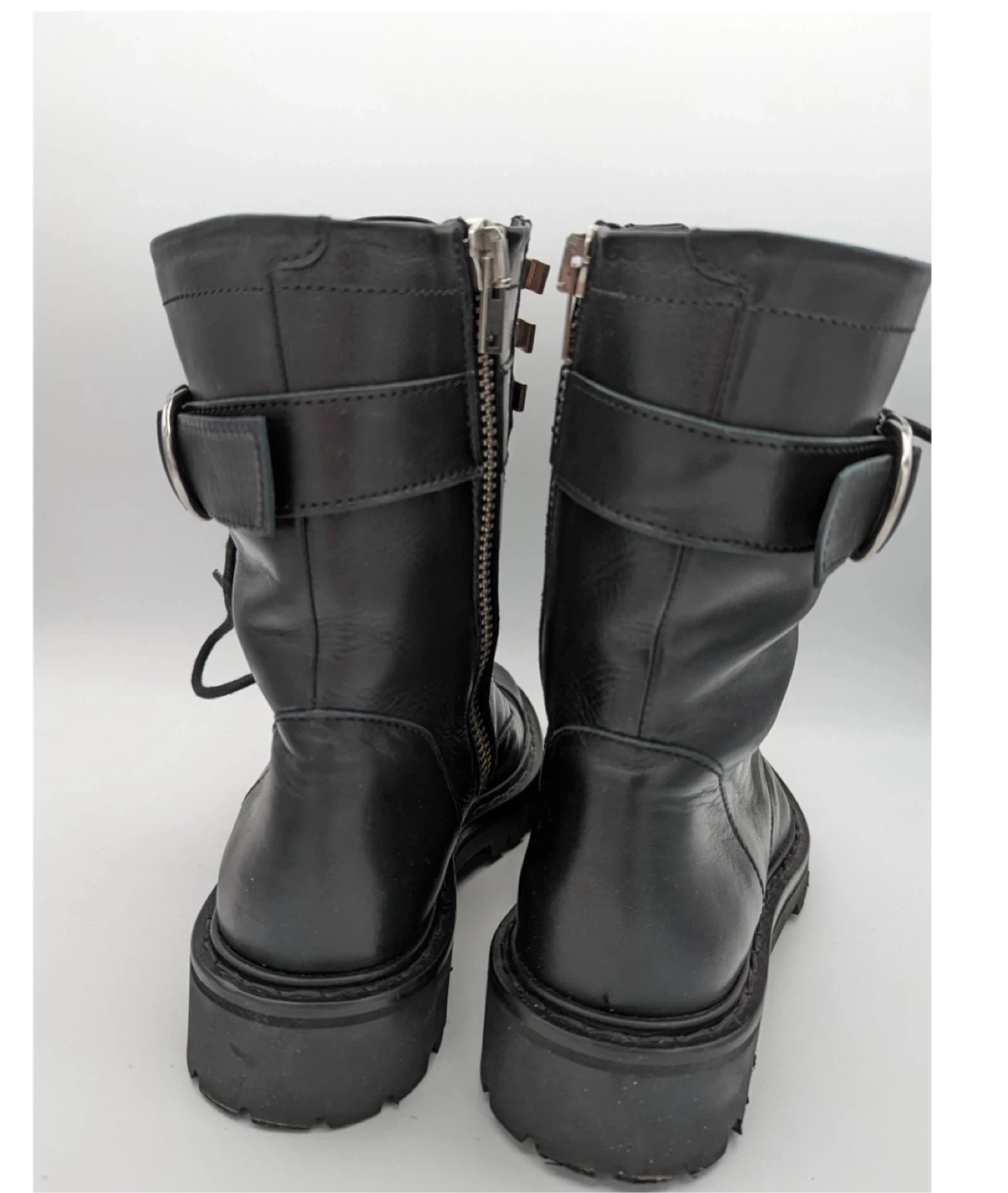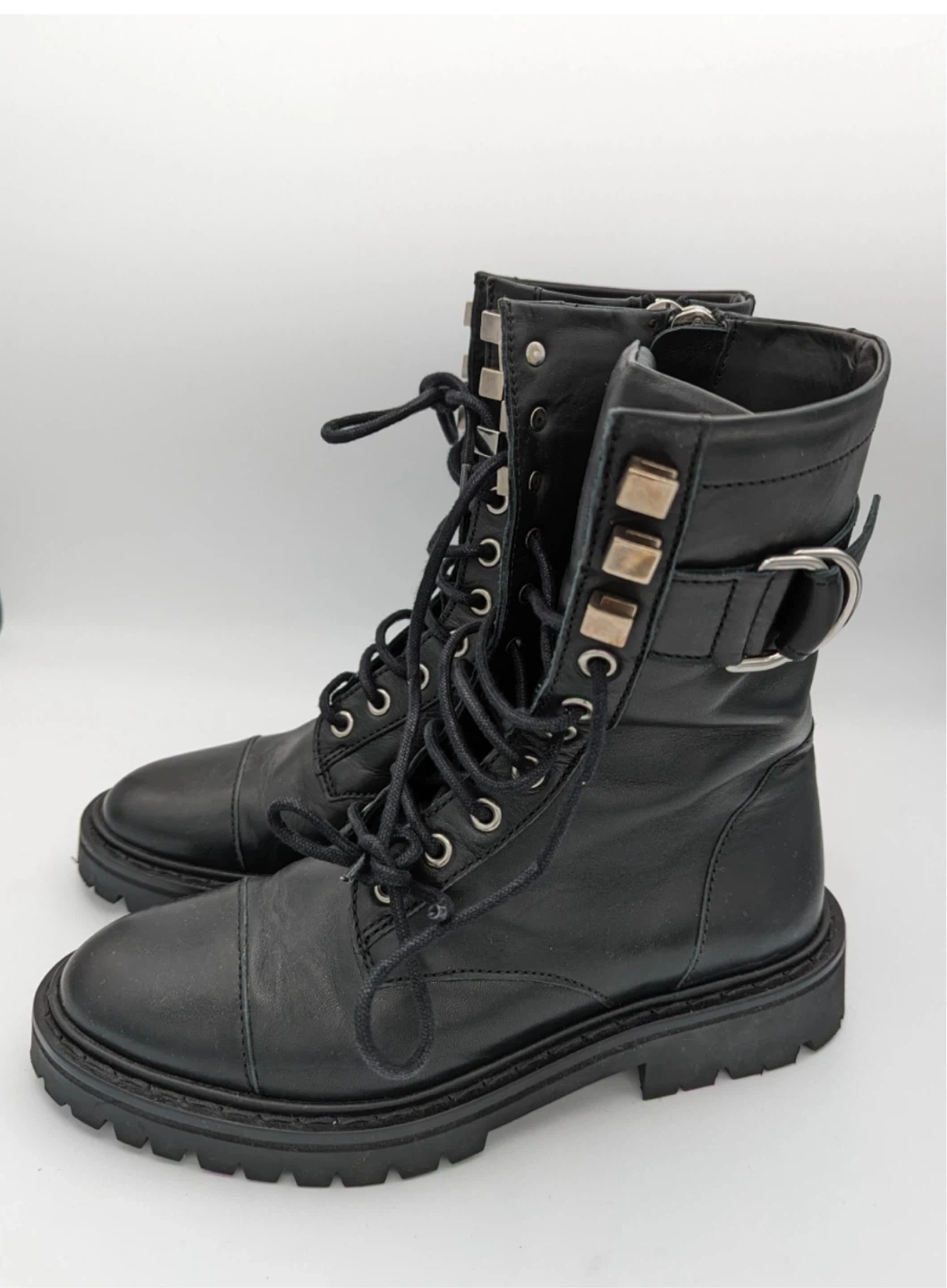 Lace-up shoes Round toe Calfskin leather Metal finishes Thick leather high-top upper Buckled strap side zipped Thick, notched sole, silver tone hardware. Gently used in excellent condition.