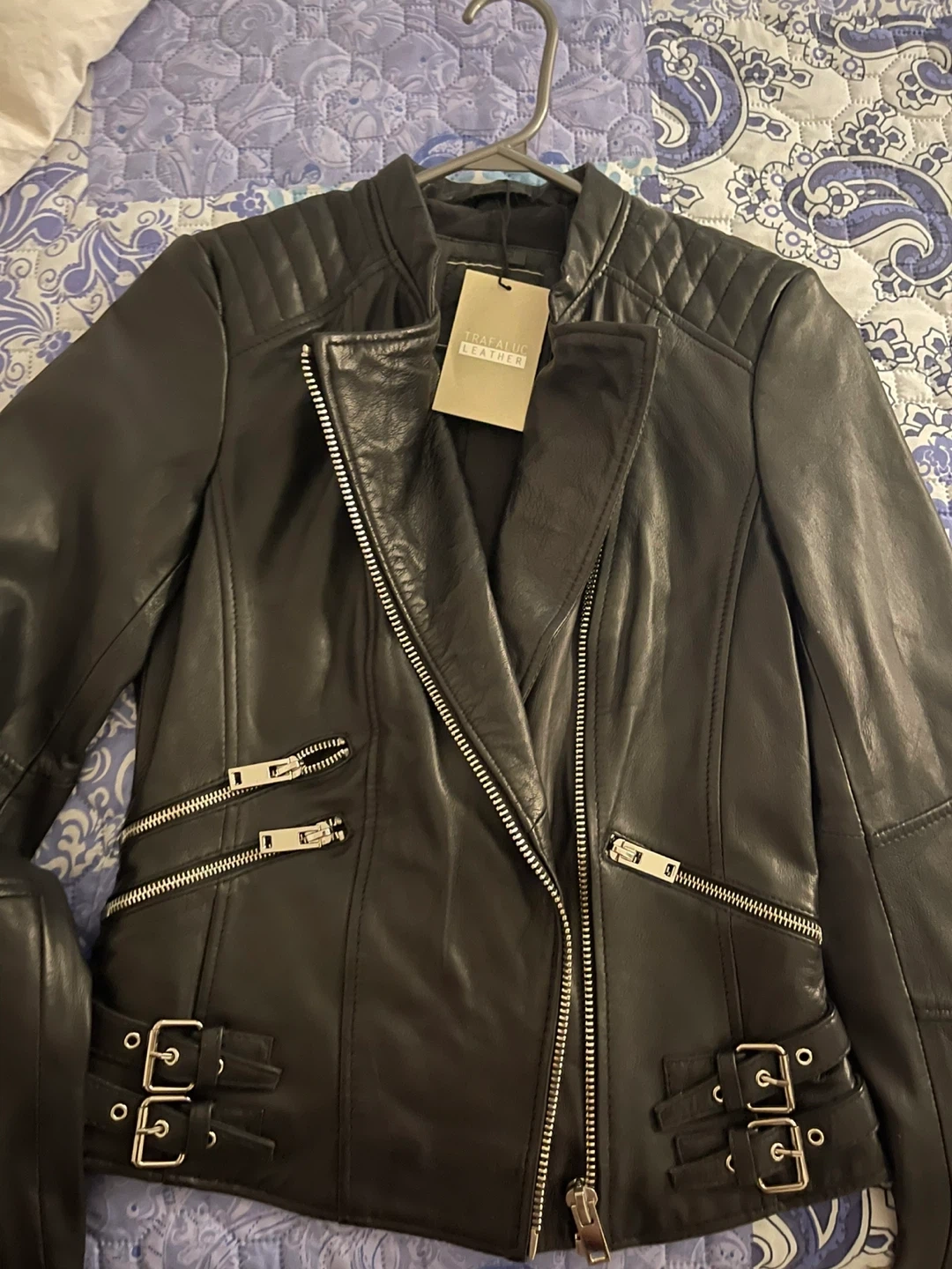 Selling a TRAFALUC leather jacket in size XS. It's in new condition and has a stylish, edgy look. Perfect for adding a bit of flair to any outfit!