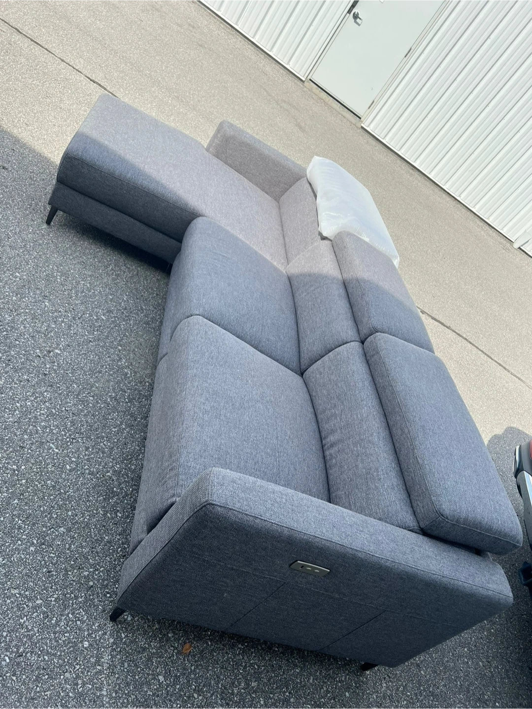 Selling a grey sectional sofa. It's in great condition and features a power recliner on one side. Perfect for a living room or entertainment area!