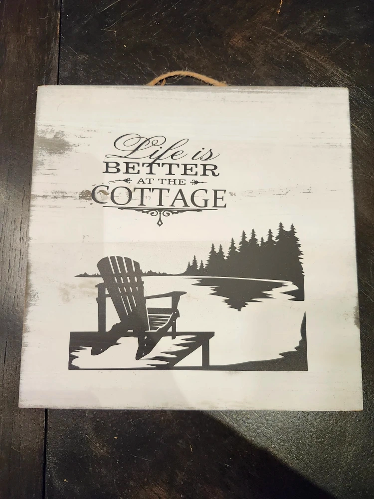 Cute wall decor with a cottage theme! It features a chair on a dock with the words "Life is Better at the Cottage". Great for adding a cozy touch to any room