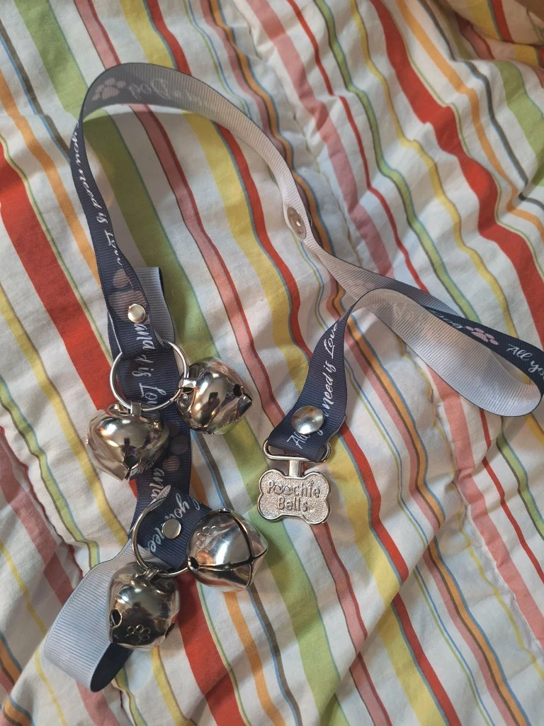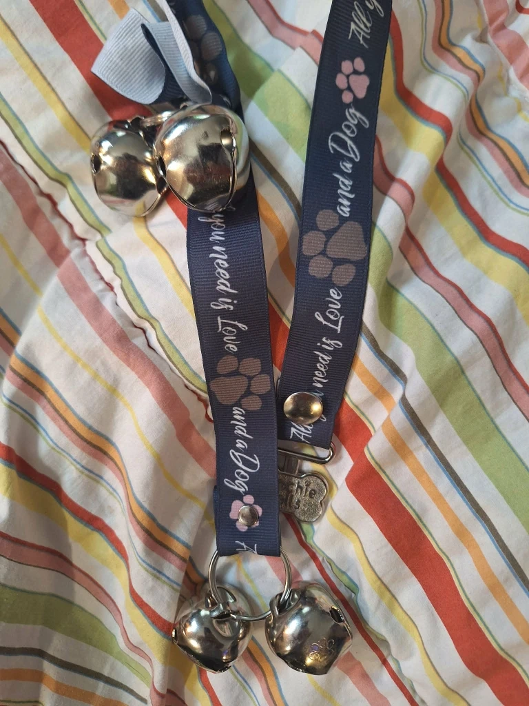 These Poochie Bells are a great way to train your dog to let you know when they need to go outside! They are in great condition and ready for a new home. The colour is navy blue with a cute paw print design and the words "All you need is Love and a Dog" printed on the ribbon