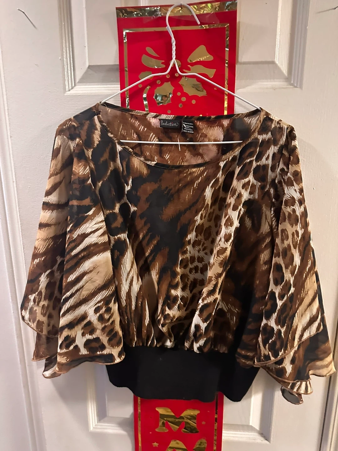 Selling a Selection leopard print blouse! It features a unique animal print design with a black base. Perfect for adding a touch of wild style to your wardrobe