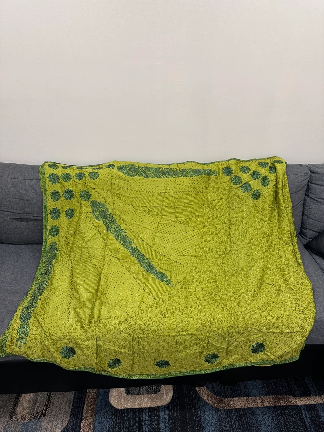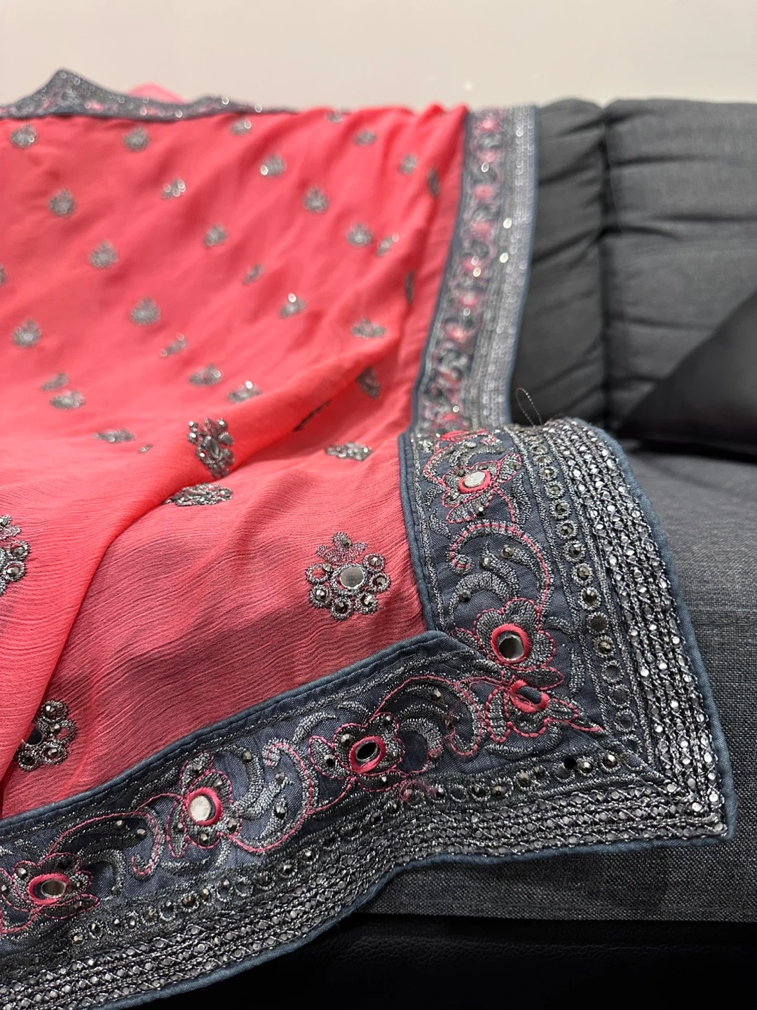 Selling a set of three beautiful Indian sarees. One is black with gold embroidery, another is a vibrant pink with silver detailing, and the third is a lovely green. Perfect for any special occasion!