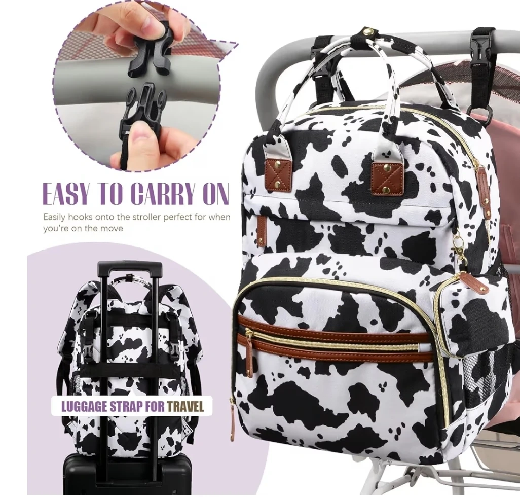 This cow print diaper bag backpack is perfect for carrying all of your baby essentials! It's easy to carry and hooks onto the stroller. It also has a luggage strap for travel.