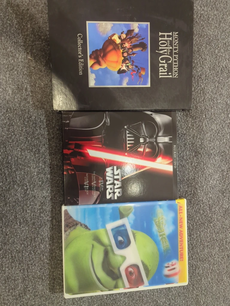 Selling a few DVDs here! First up is Monty Python and the Holy Grail Collector's Edition. Also included are Star Wars: original trilogy (Blu-ray + DVD) and Shrek! 3D. (Includes glasses)