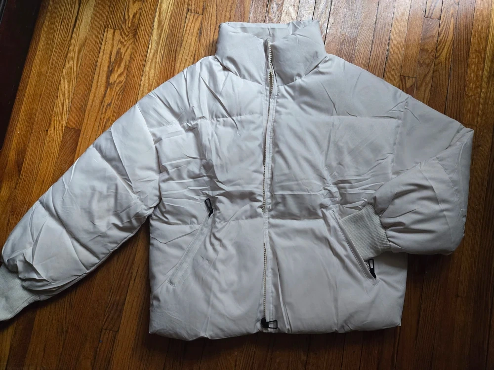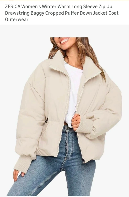 Selling a ZESICA Women's Winter Warm Long Sleeve Zip Up Drawstring Baggy Cropped Puffer Down Jacket Coat Outerwear. It's a stylish and cozy jacket, perfect for the winter season. The jacket features a zip-up front, drawstring, and baggy cropped fit! It is ment to be oversized so fill be good for sizes S-L depending on how oversized you want it to be.