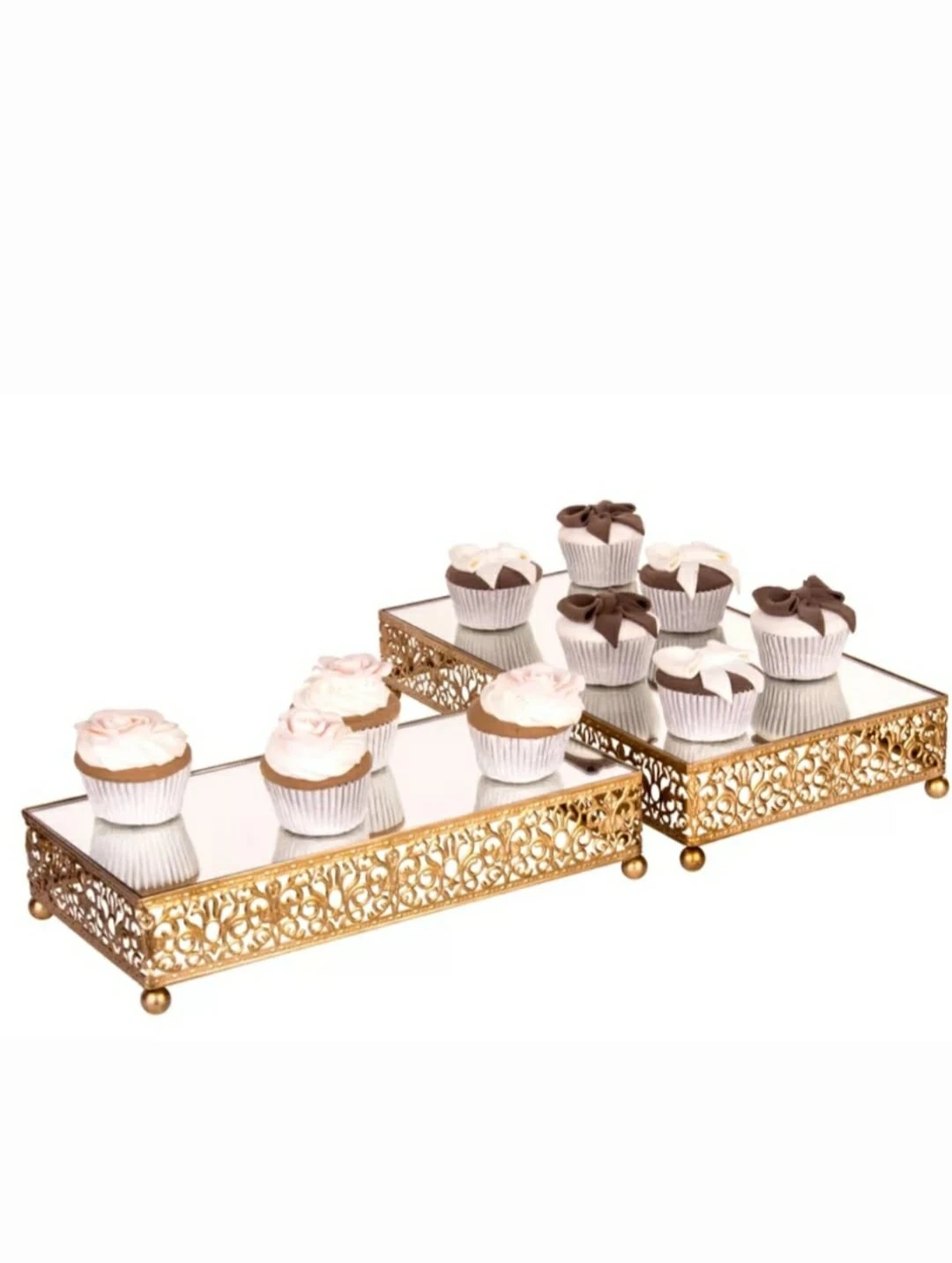 Here's a lovely set of two cupcake stands! They feature a gold metal frame with intricate detailing and a mirrored surface. Perfect for displaying your baked goods or adding a touch of elegance to your dessert table
