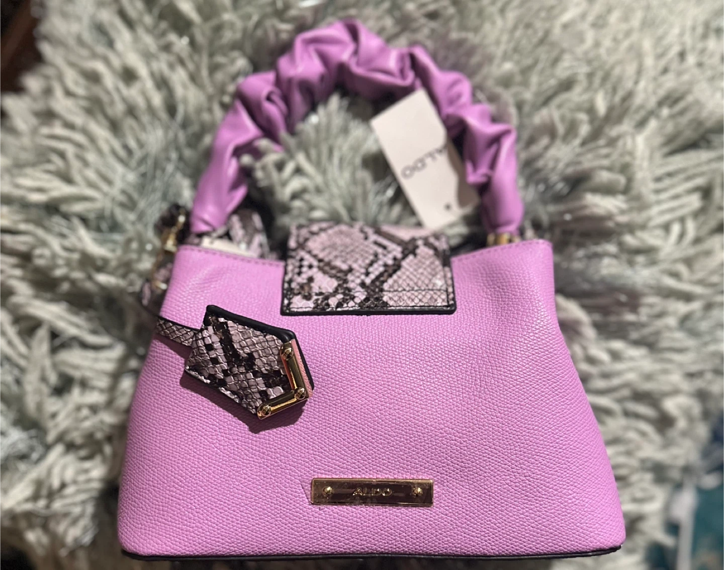 This cute ALDO top handle bag It features a unique lavender colour with snake print detailing on the straps and top flap. Perfect for adding a pop of colour to any outfit!