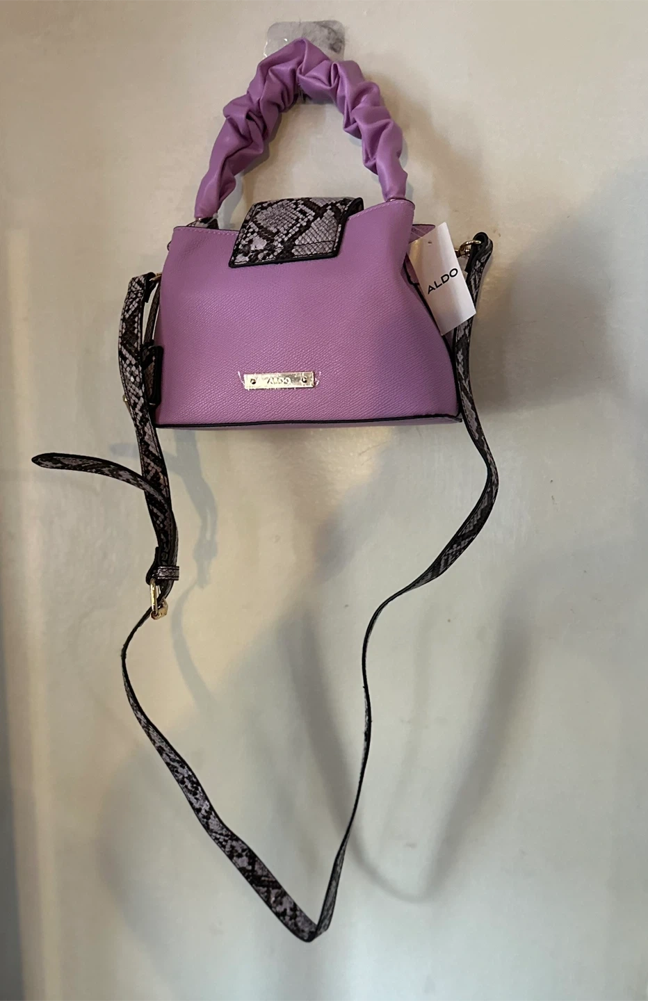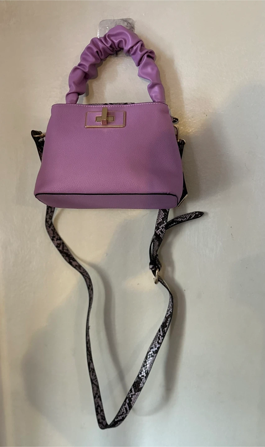 This cute ALDO top handle bag It features a unique lavender colour with snake print detailing on the straps and top flap. Perfect for adding a pop of colour to any outfit!