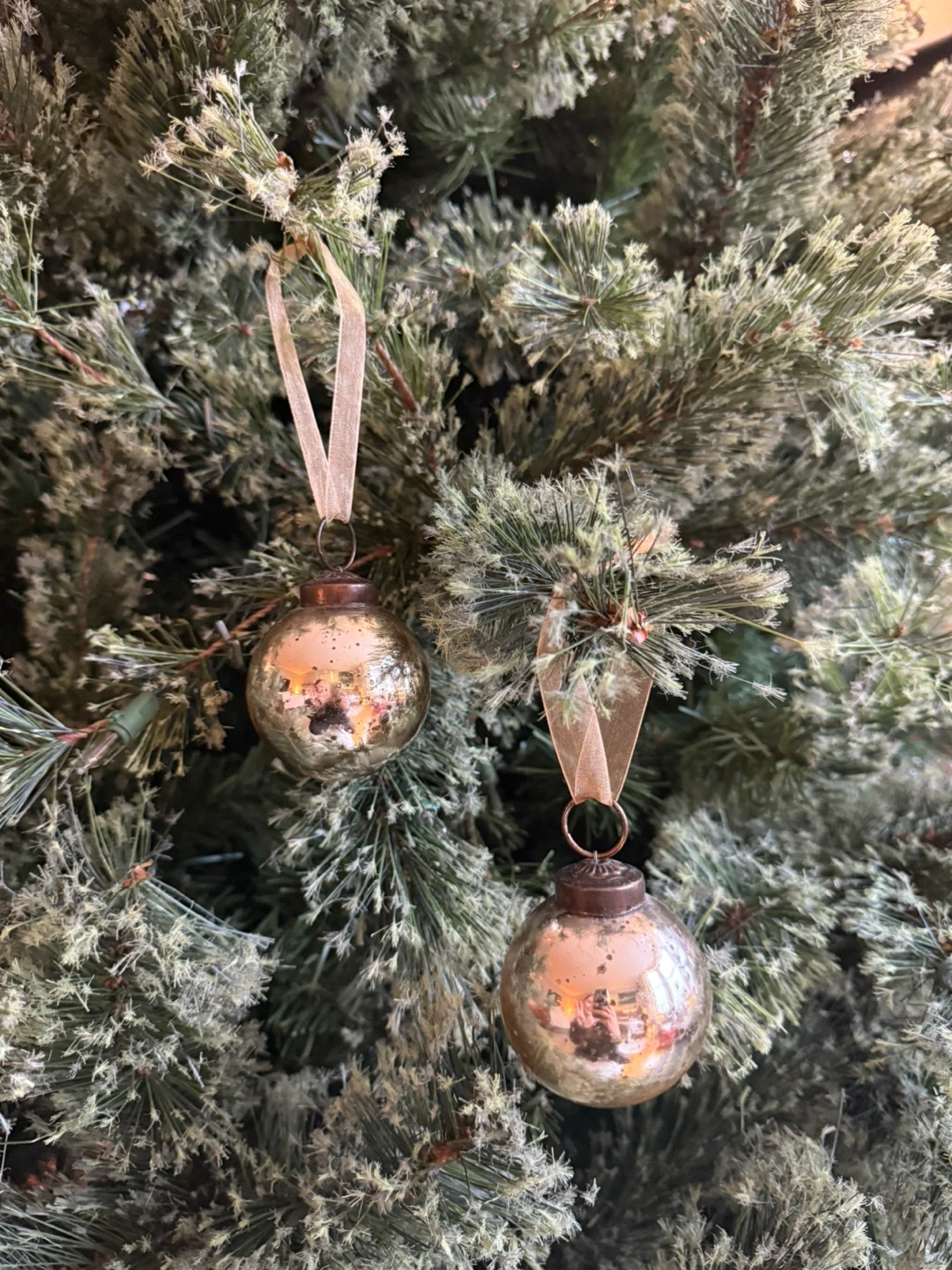 Set of 2 vintage-style aged silvery mercury glass round baubles perfect for holiday decor 🎄 with a pale champagne shimmer ribbon for hanging.