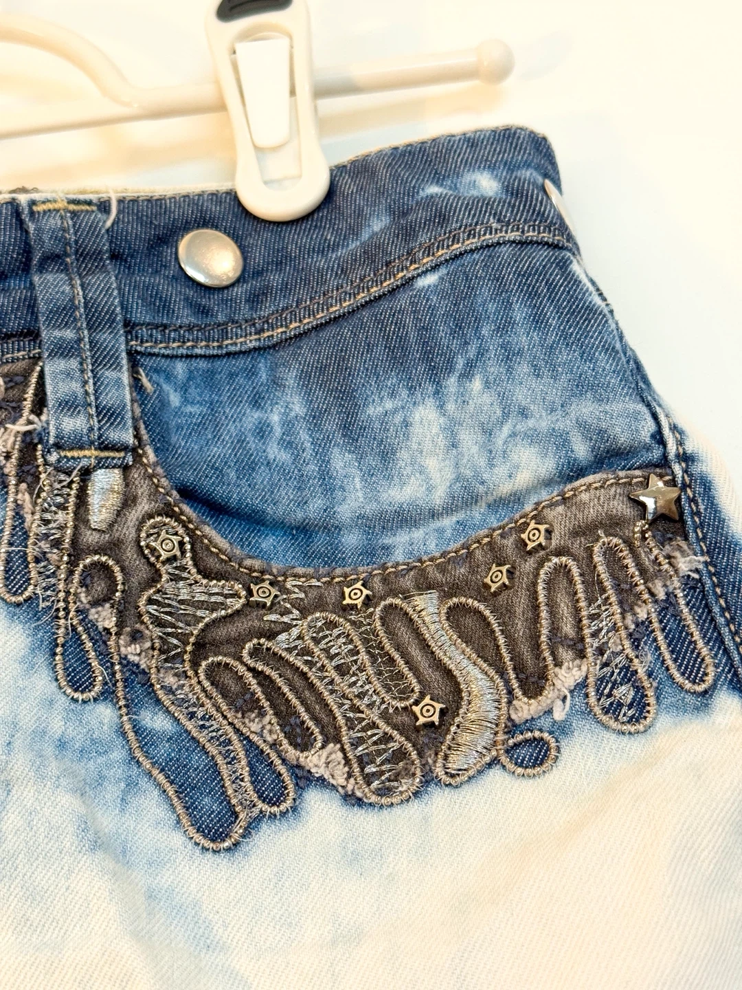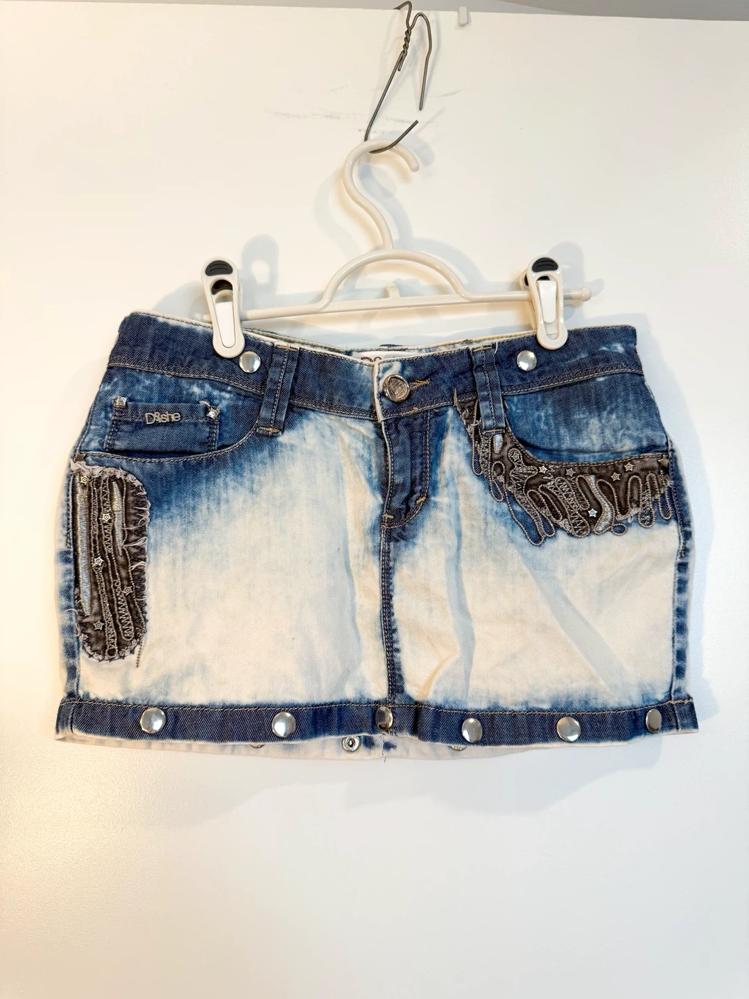 Dishe Denim Vintage Mini Skirt / Distressed Embroidered Skirt