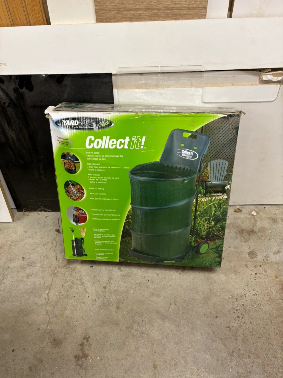 Selling a Yardwise Collect It! yard waste bin. It holds up to 32 gallons and makes yard clean-up easy. It features a built-in scoop and clips to secure a garbage bag. It also folds down for easy storage. Some assembly required. Still in box, never used.