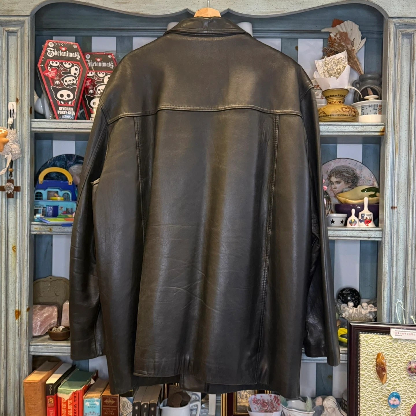 green leather, classic blazer, buttery leather, oversized jacket, black accents, structured fit, vintage outerwear, full-length coat, preppy style, versatile layering