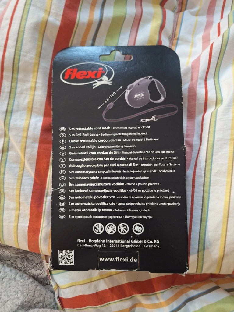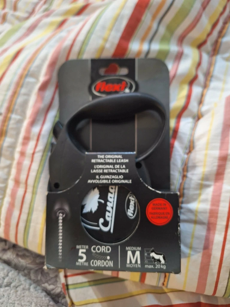 Selling a Flexi retractable dog leash! It has a 5-meter cord and is suitable for medium-sized dogs up to 20kg. It's in great condition and comes with the original packaging and instruction manual