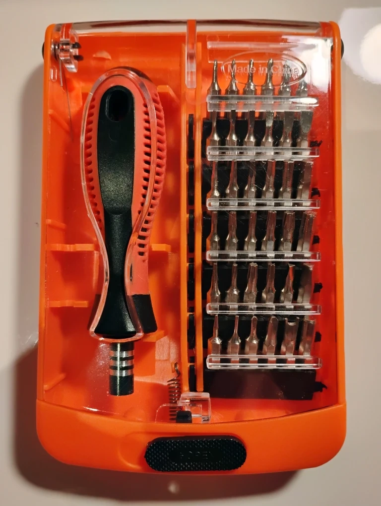 Screwdriver set with assorted magnetic bits and orange flip-top carrying case. Includes phillips, slotted, hex, triangle and more.