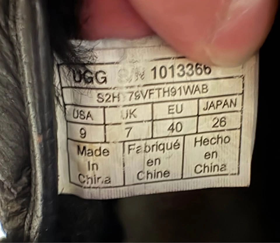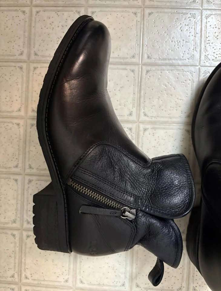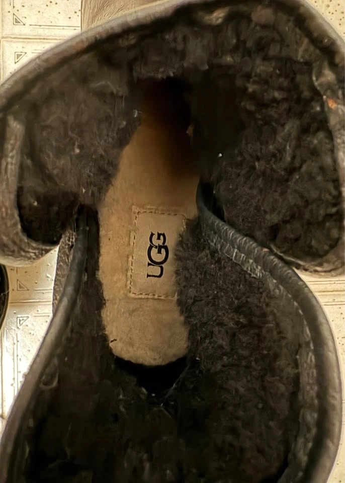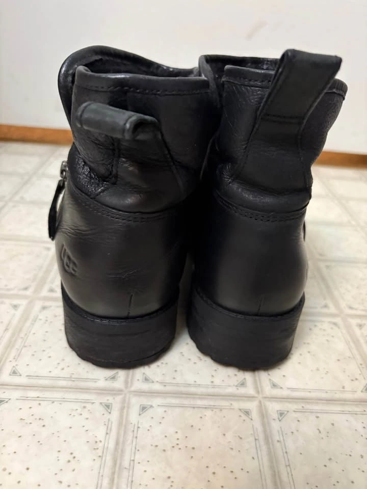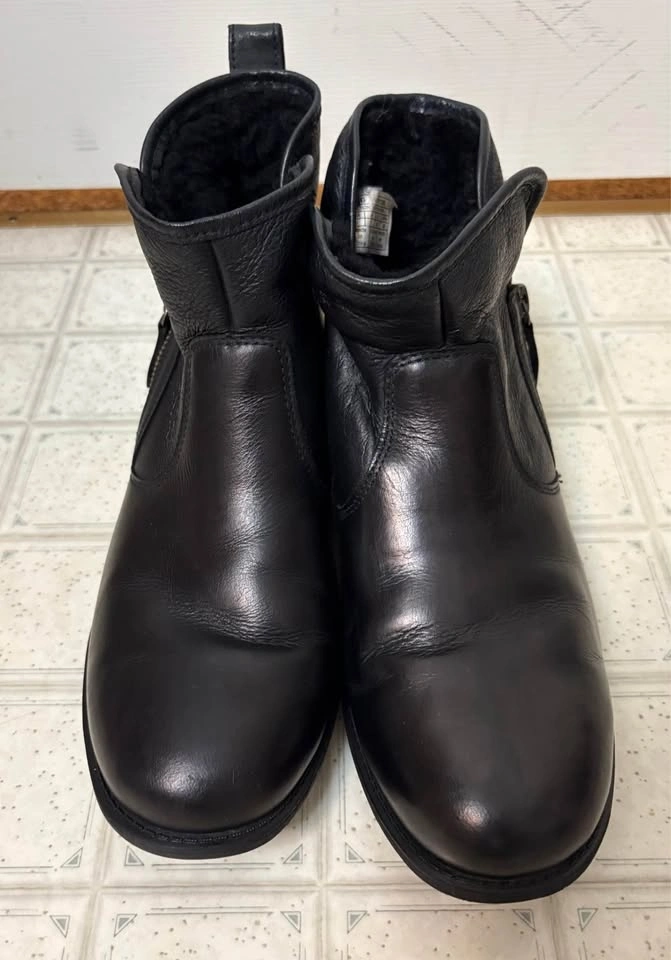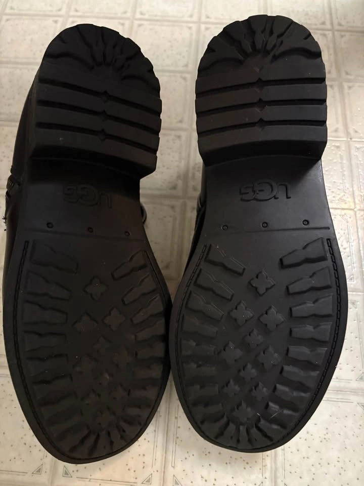 These boots were only worn inside, so there is no wear and tear on the soles. No defects on the outsole. Black. Size 9.