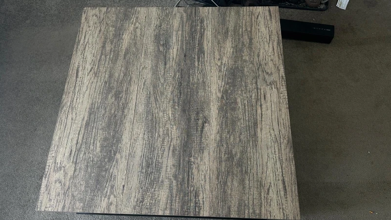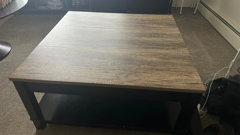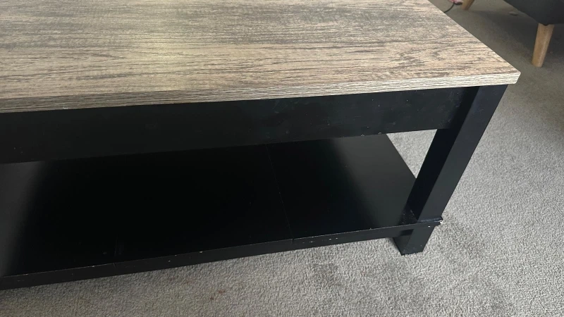 Selling a coffee table with a wood-look top and a black base. It has a shelf underneath for storage. It's in good condition and would be a great addition to any living room
