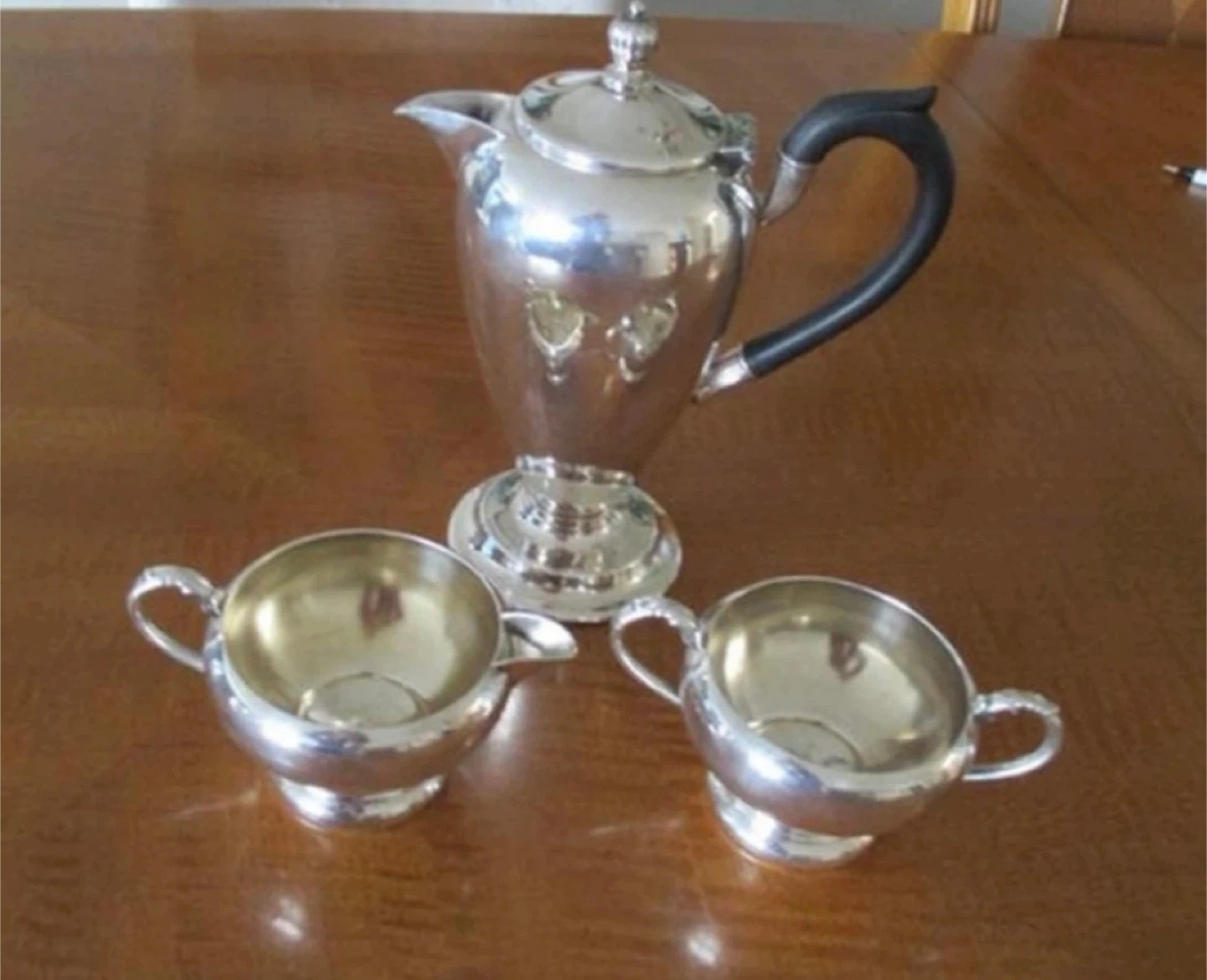 Beautiful vintage silver plated tea set. It includes a teapot, a sugar bowl, and a creamer. This set would look lovely on display or for serving tea.