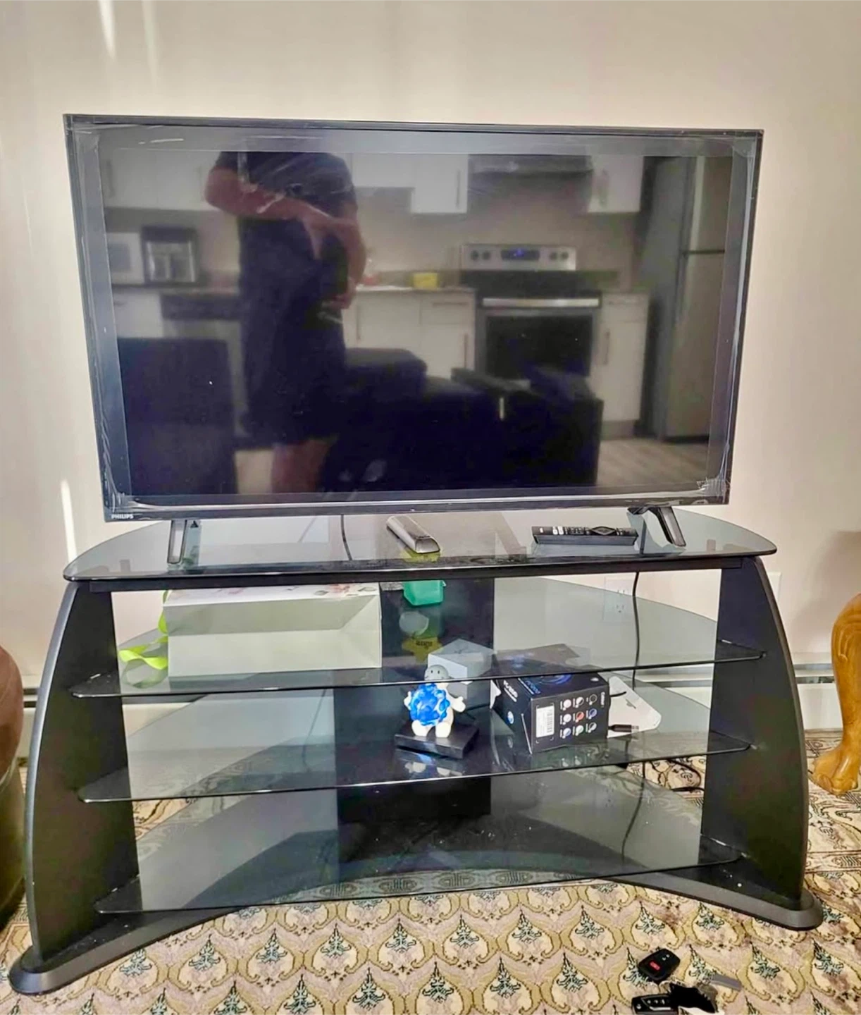 Selling a Philips TV that comes with a stylish glass stand! It's in great condition and would be a perfect addition to any living room or entertainment area TV with Trolly moving out