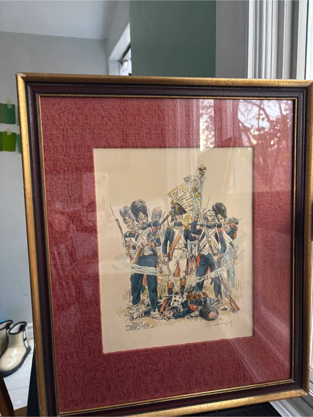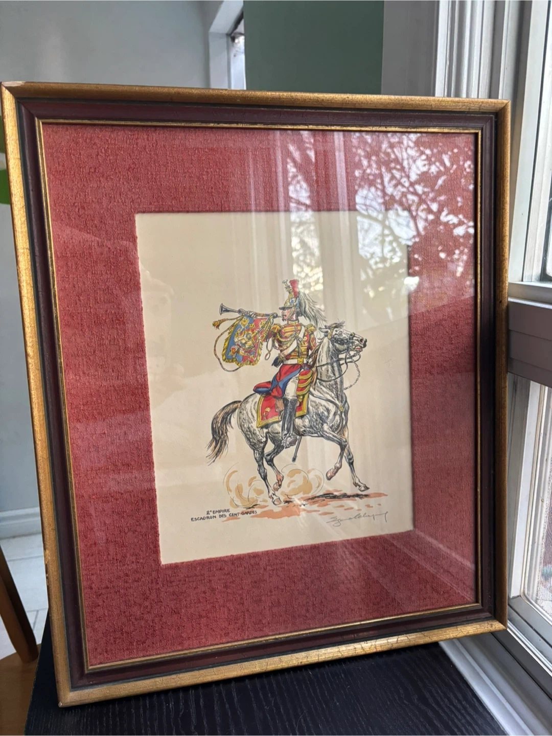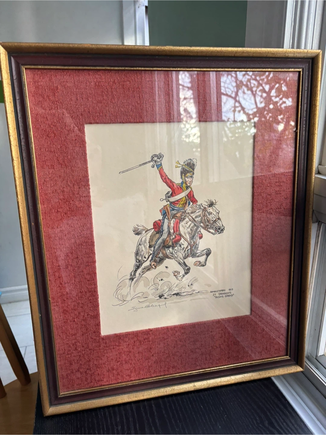 Selling a set of three framed art prints featuring military figures on horseback and soldiers. The frames are a dark wood with a gold trim and red matting. They'd look great in a den or office!