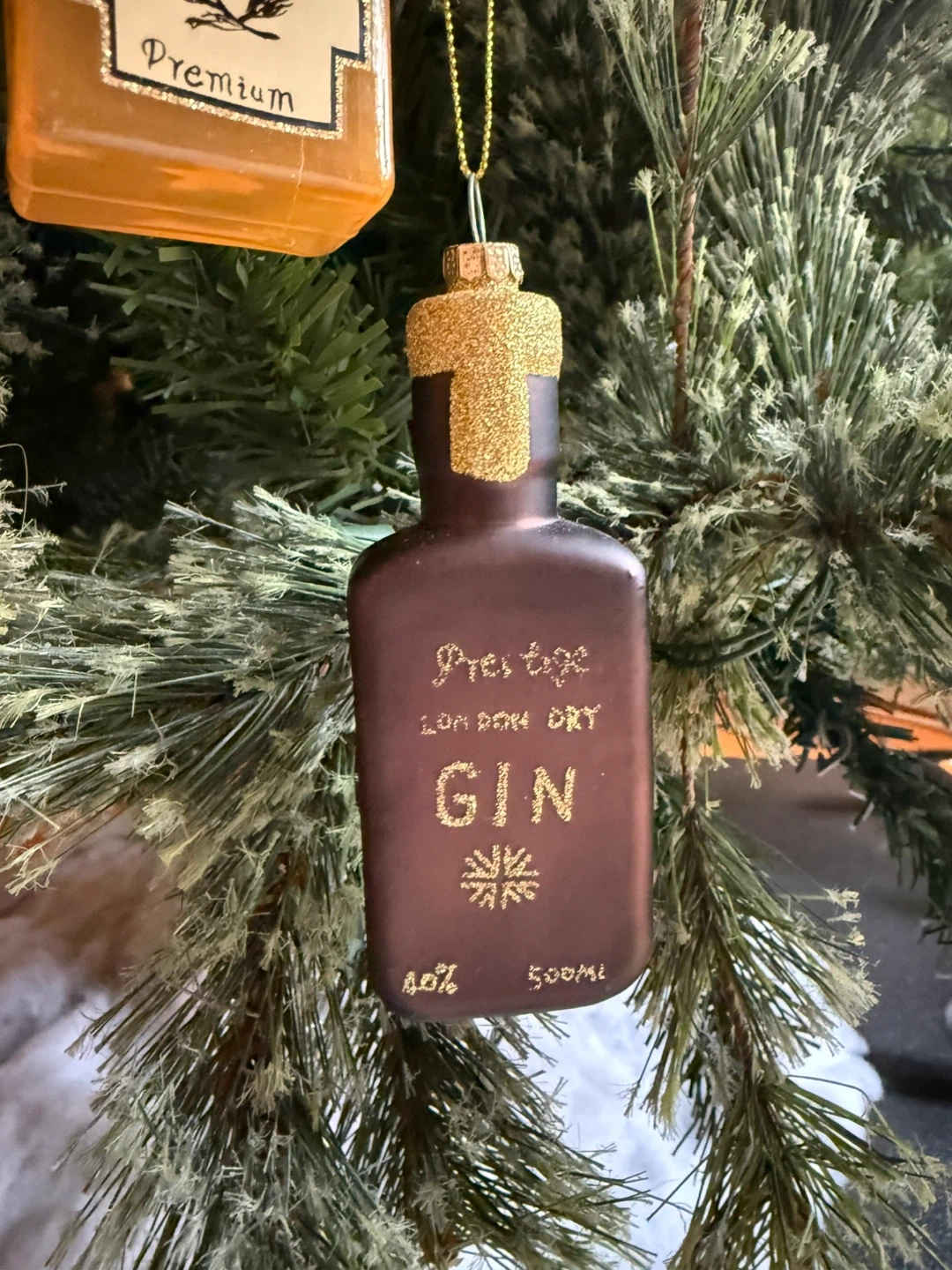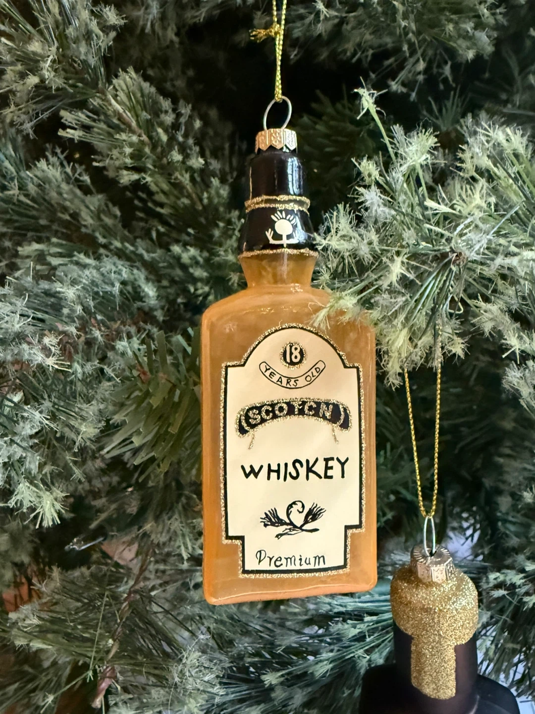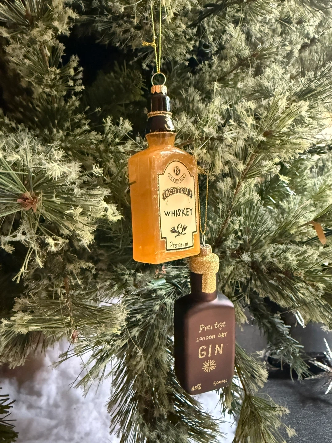 Selling a set of hand blown glass holiday ornaments — one is a “whisky” bottle and one is a “gin” bottle. Purchased from The Cross Decor & Design in Yaletown (Vancouver).