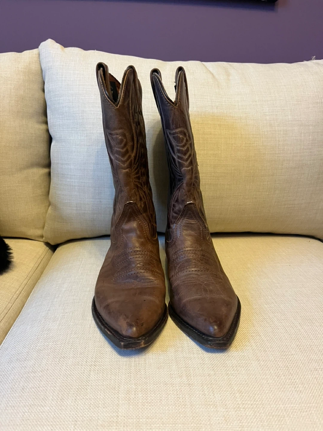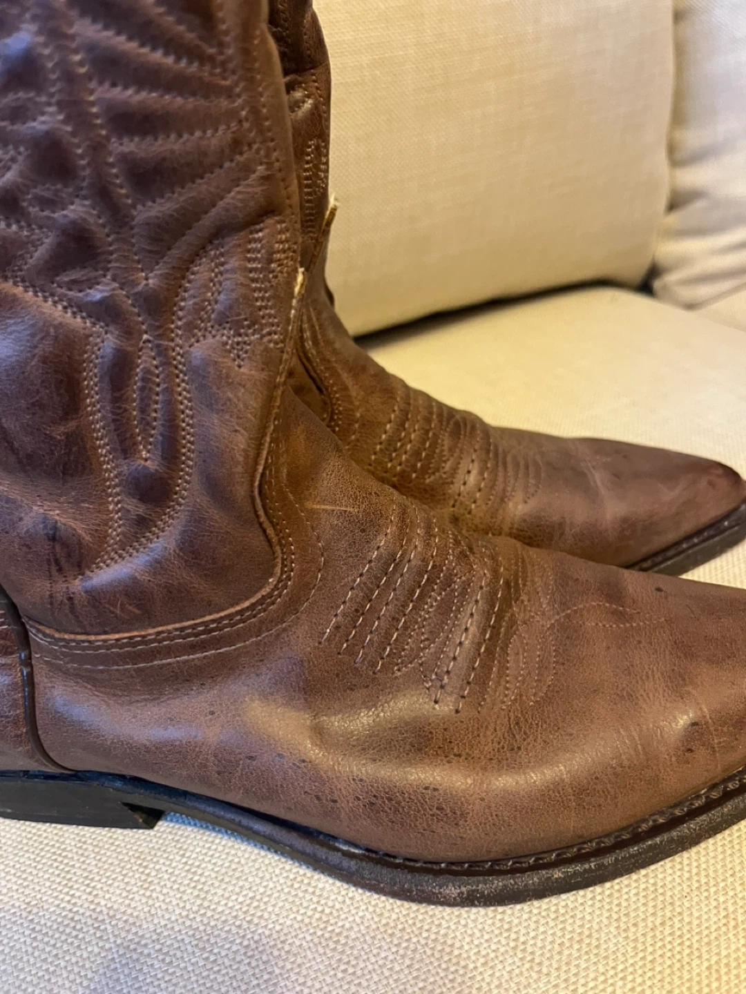 Selling a pair of brown leather cowboy boots! They have a cool, classic look with detailed stitching. They're in excellent condition and ready for a new home! Size 8. Hardly worn.