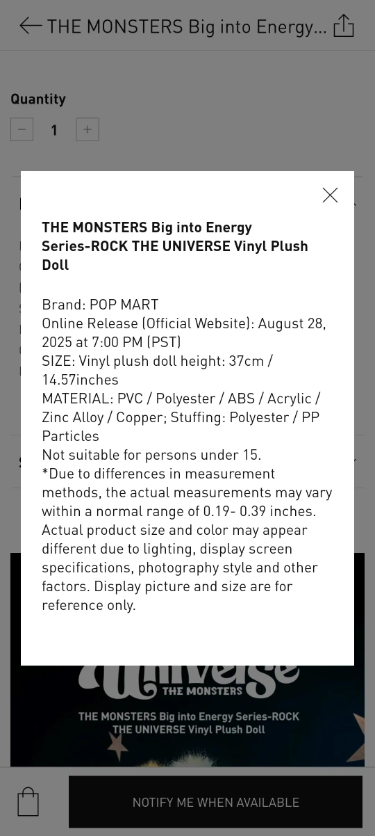 This is a POP MART THE MONSTERS Big into Energy Series-ROCK THE UNIVERSE Vinyl Plush Doll. The doll is made of PVC, Polyester, ABS, Acrylic, Zinc Alloy, Copper, Stuffing, and PP Particles. The doll's height is 37cm / 14.57 inches. Comes with the original box!