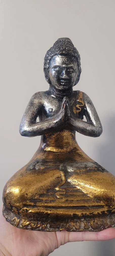 A beautiful Buddha statue with a mix of gold and silver colours! It's a lovely decorative piece that could add a touch of serenity to any room