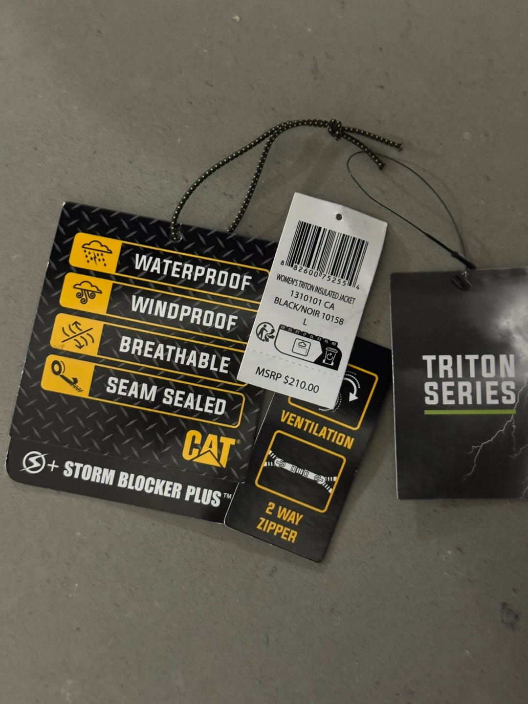 Selling a CAT Triton insulated jacket in size L. It's waterproof, windproof, and breathable, with seam-sealed construction. Features include ventilation and a 2-way zipper. Originally bought for $210! It was bought for my husband (thinking it was a men’s coat) and I can’t return it because he took off the tags already
